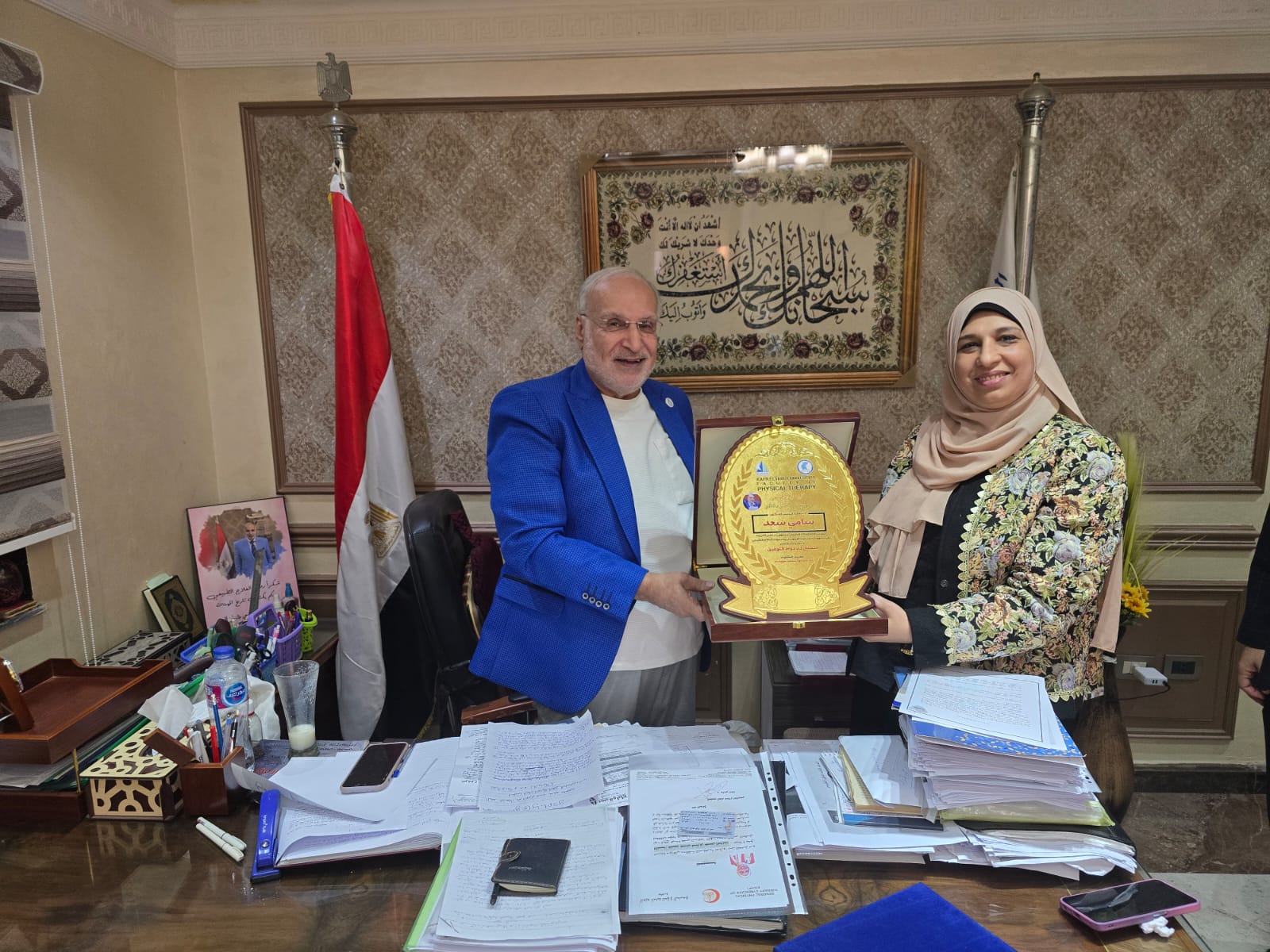 Prof. Dr. Mahmoud Awida, Dean of the Faculty, met with Mr. Sami Saad, General Secretary of the Faculty of Physical Therapy in Egypt and the Board of Directors of the Syndicate, which witnessed tangible support from him to all graduates of the Faculty of Physical Therapy, Kafrelsheikh University. His Excellency presented a shield in honor of Mr. Prof. Dr. Mahmoud Awida, Dean of the Faculty, and Prof. Dr. Iman Abdel Fattah, Vice Dean of the Faculty for Postgraduate Studies and Research. His Excellency pledged to remove all obstacles for graduates and members of the Faculty of Physical Therapy, Kafrelsheikh University. Prof. Dr. Iman Abdel Fattah, Vice Dean of the Faculty for Postgraduate Studies, conducted a set of protocols to present distinguished scientific lectures by international lecturers for faculty members, assistants, students and graduates. The date and participants will be announced soon to be the first fruits of the experience of graduates and students at the faculty by activating the role of the Continuing Education Unit at the faculty.