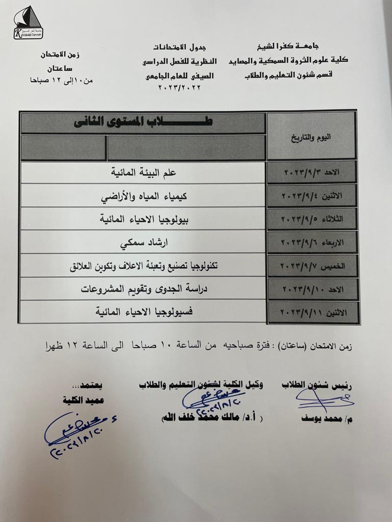 جدول امتحانات المستوي الثاني للفصل الدراسي الصيفي للعام الجامعي 2022/2023