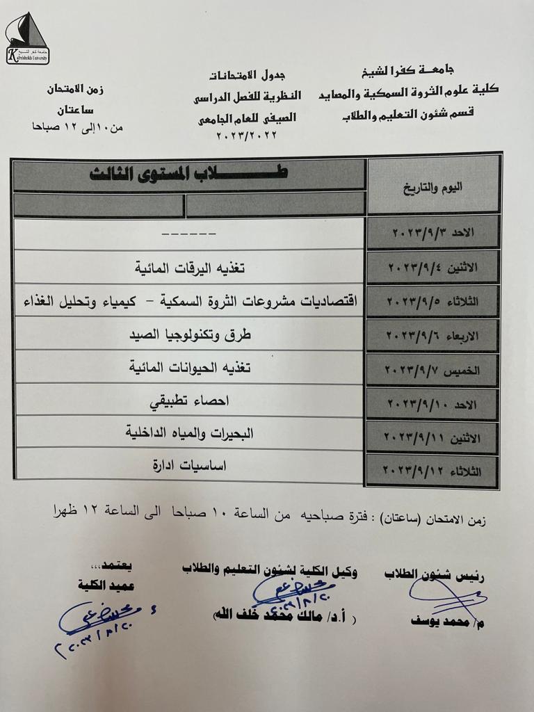 جدول امتحانات المستوي الثالث للفصل الدراسي الصيفي للعام الجامعي 2022/2023