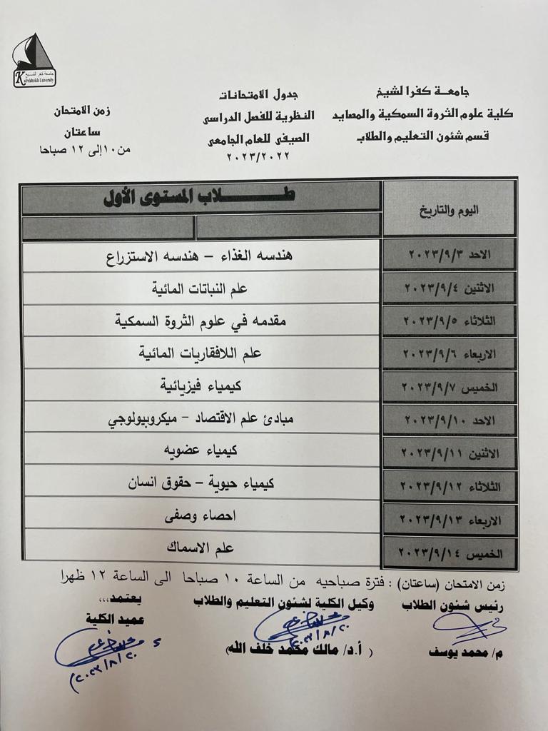 جدول امتحانات المستوي الاول للفصل الدراسي الصيفي للعام الجامعي 2022/2023
