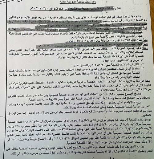 دعوة لعقد جمعية عمومية عادية لنادي اعضاء هيئة التدريس بجامعة كفر الشيخ