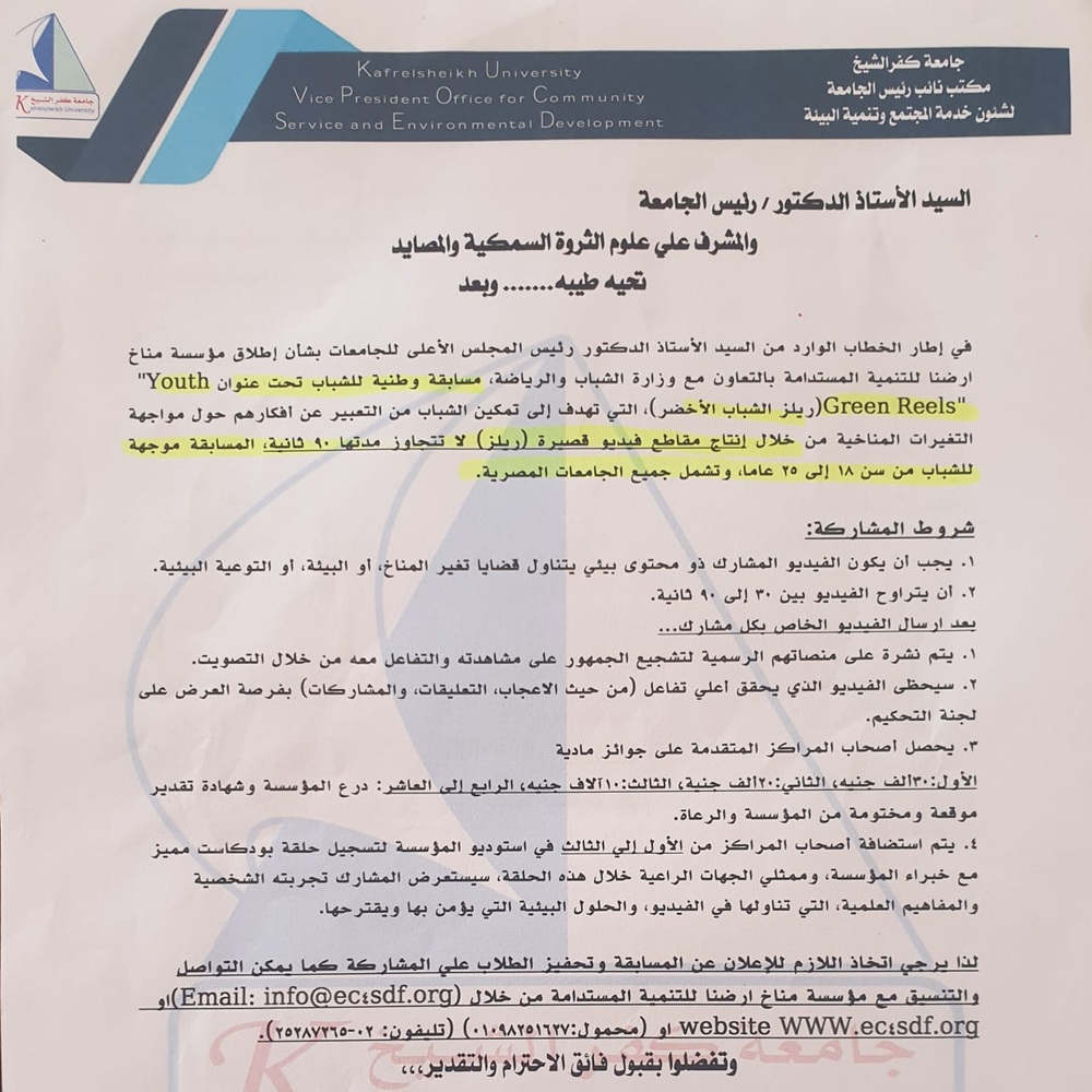 اعلان عن مسابقة وطنية للشباب تحت عنوان "youth green reels" ( ريلز الشباب الاخضر)