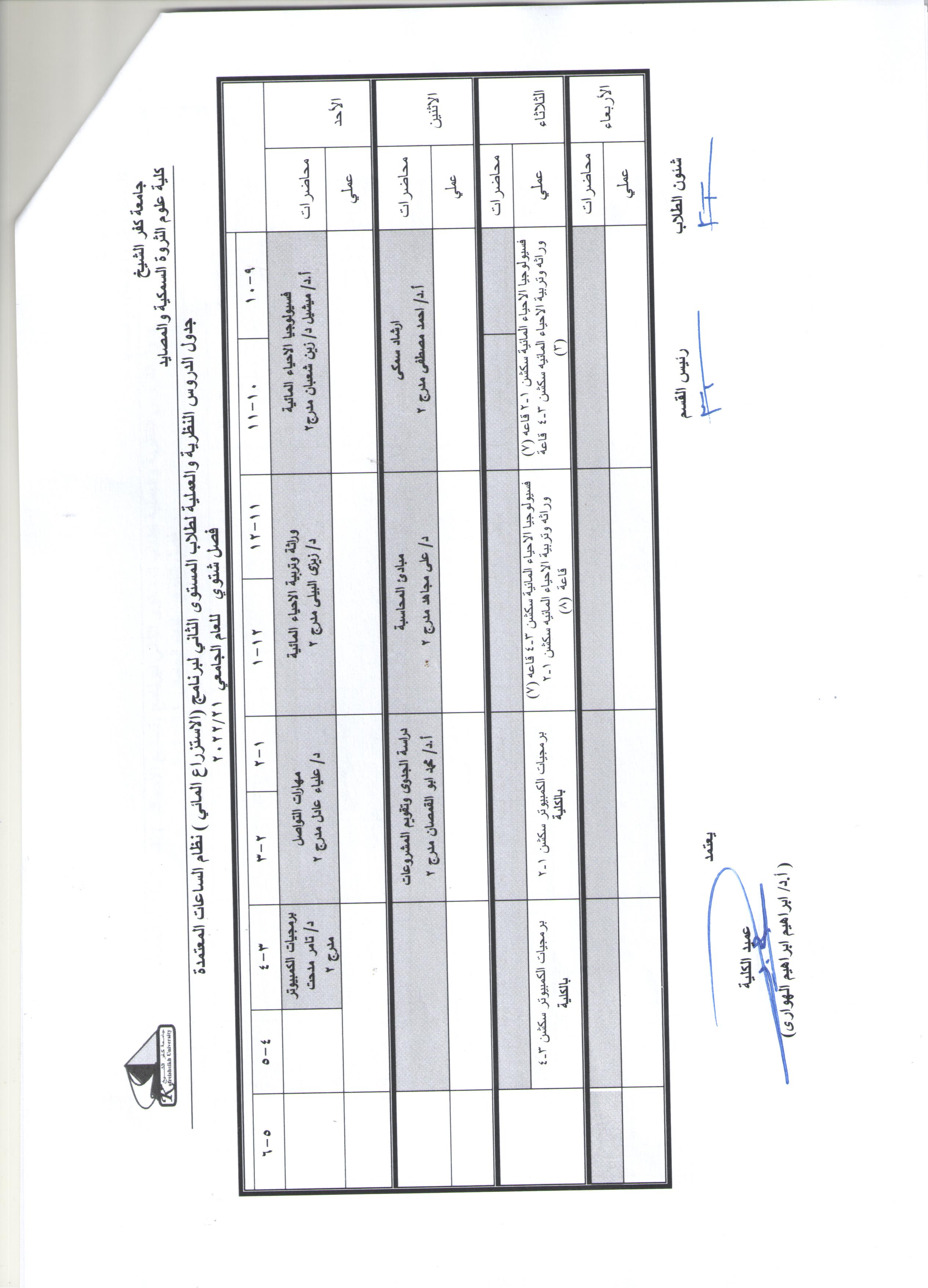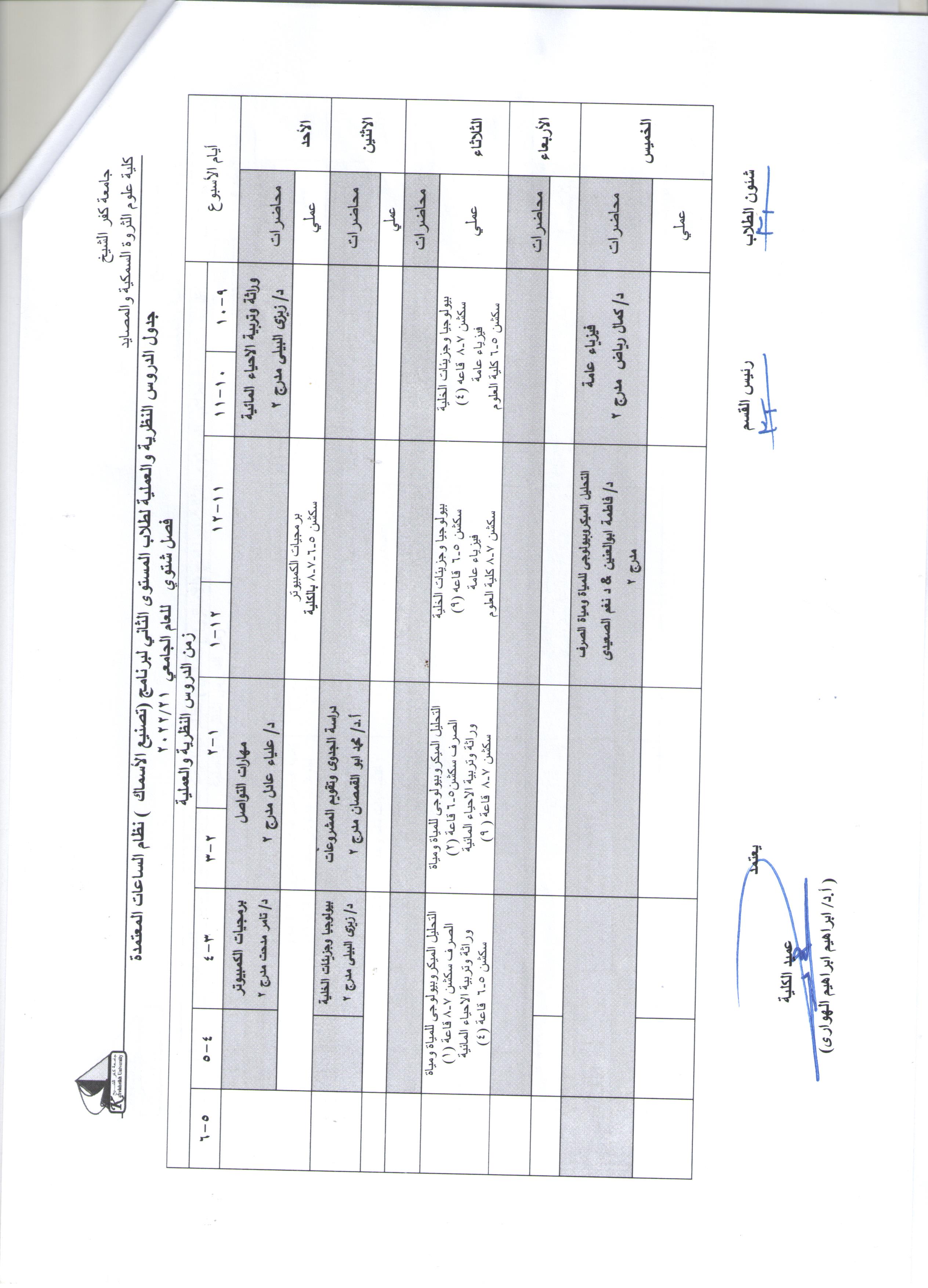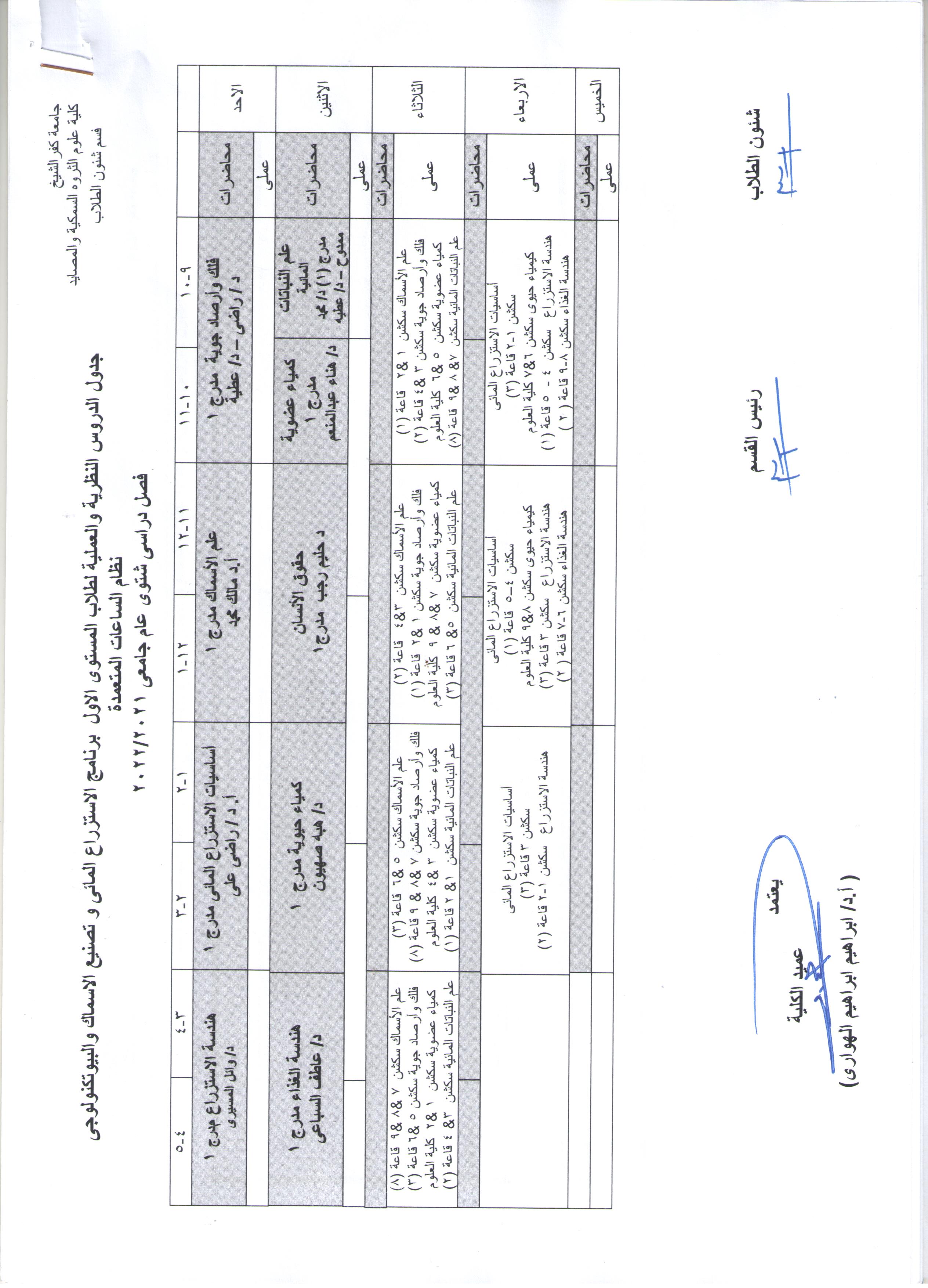 جدول المستوي الثاني قسم الاستزراع للفصل الشتوي للعام الجامعي 2021/2022