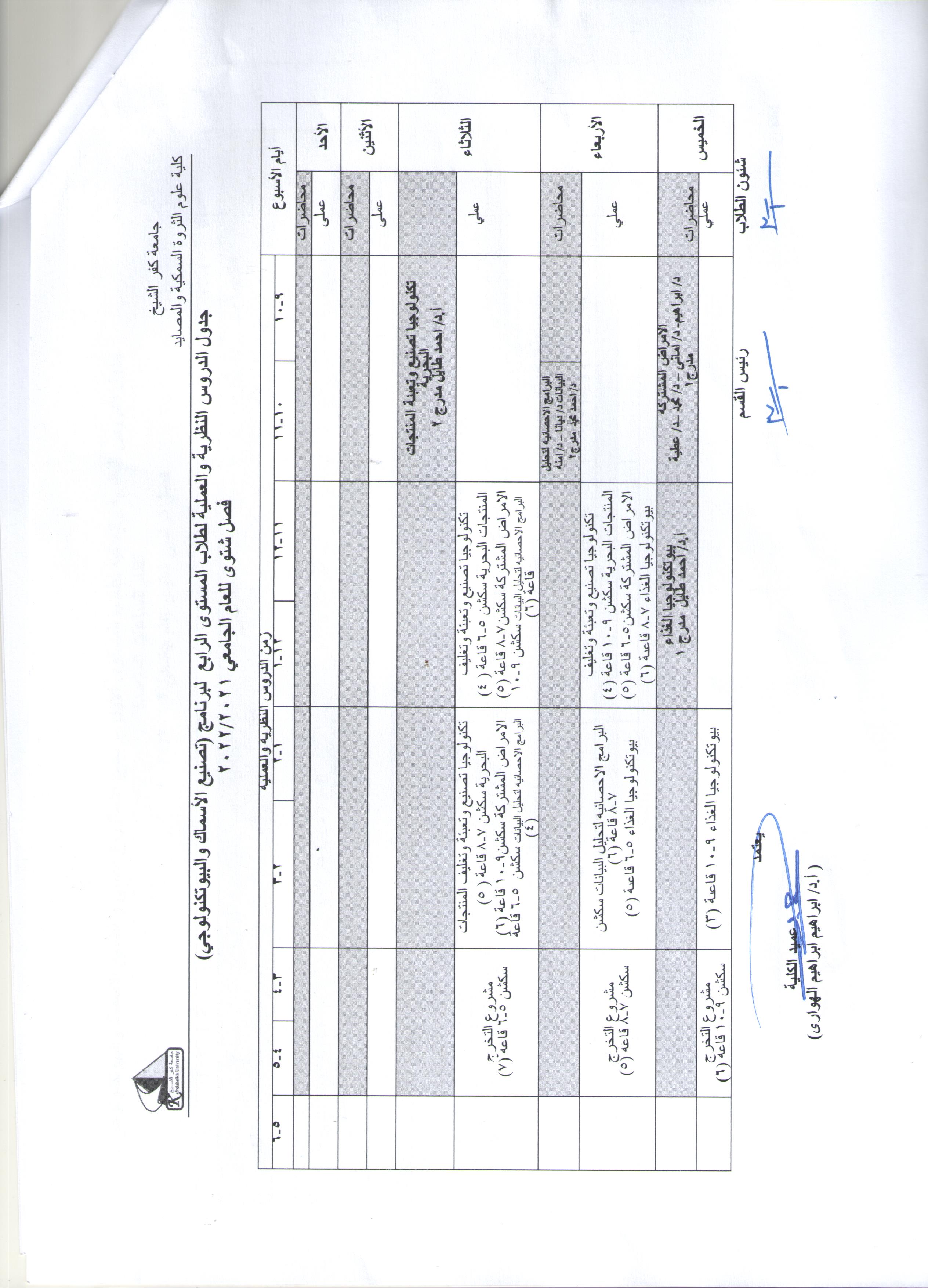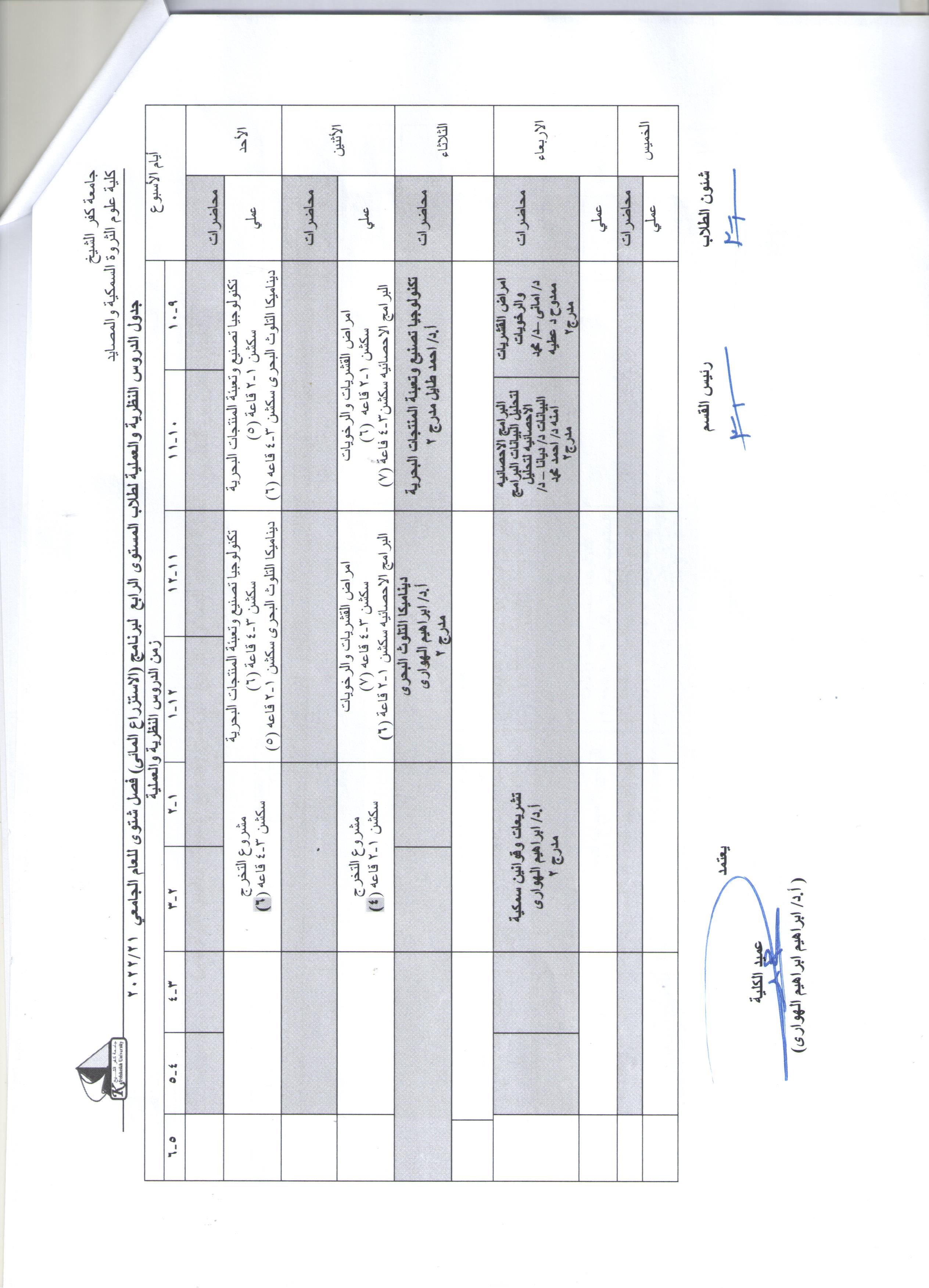 جدول المستوي الرابع قسم الاستزراع للفصل الشتوي للعام الجامعي 2021/2022