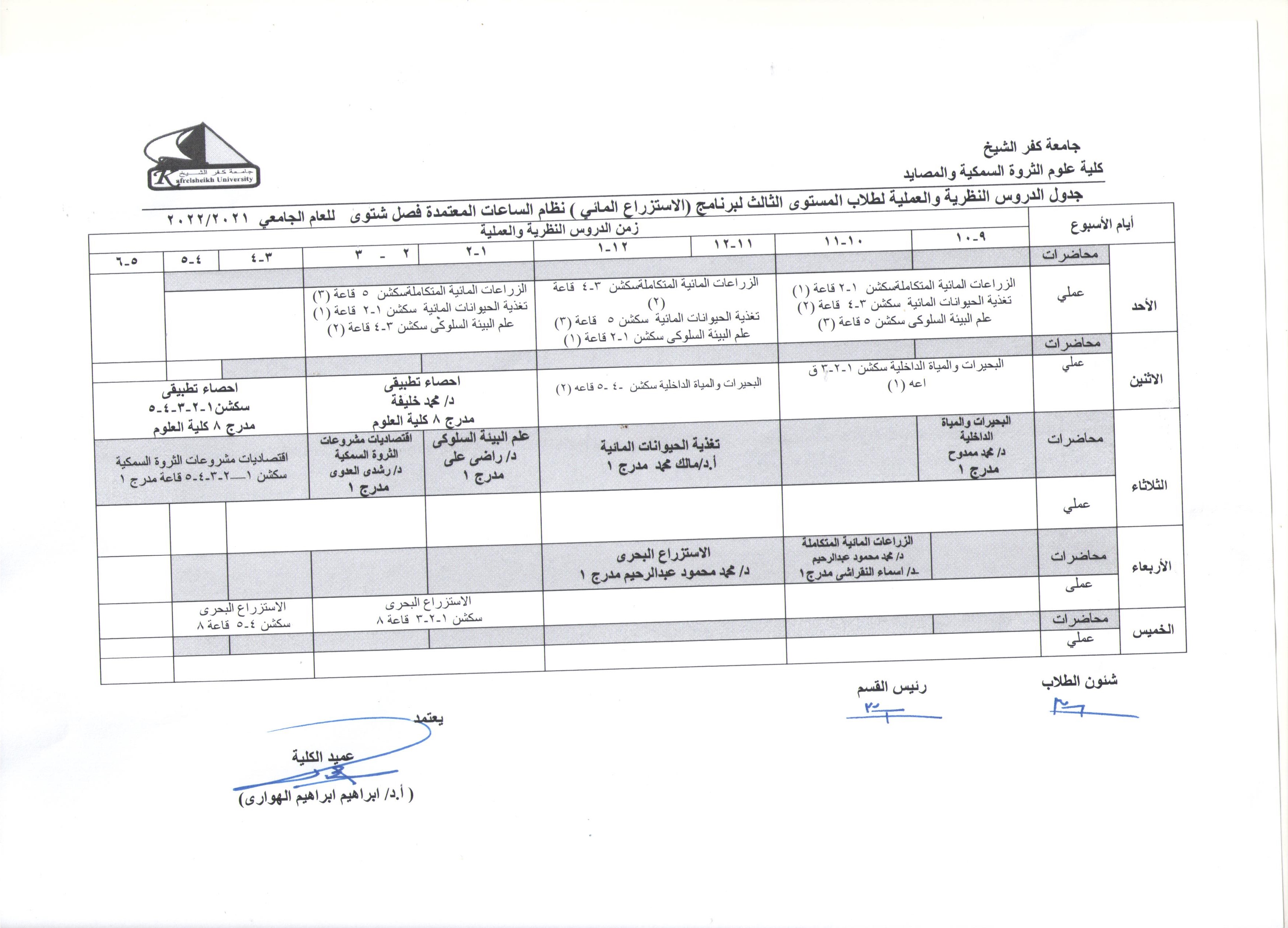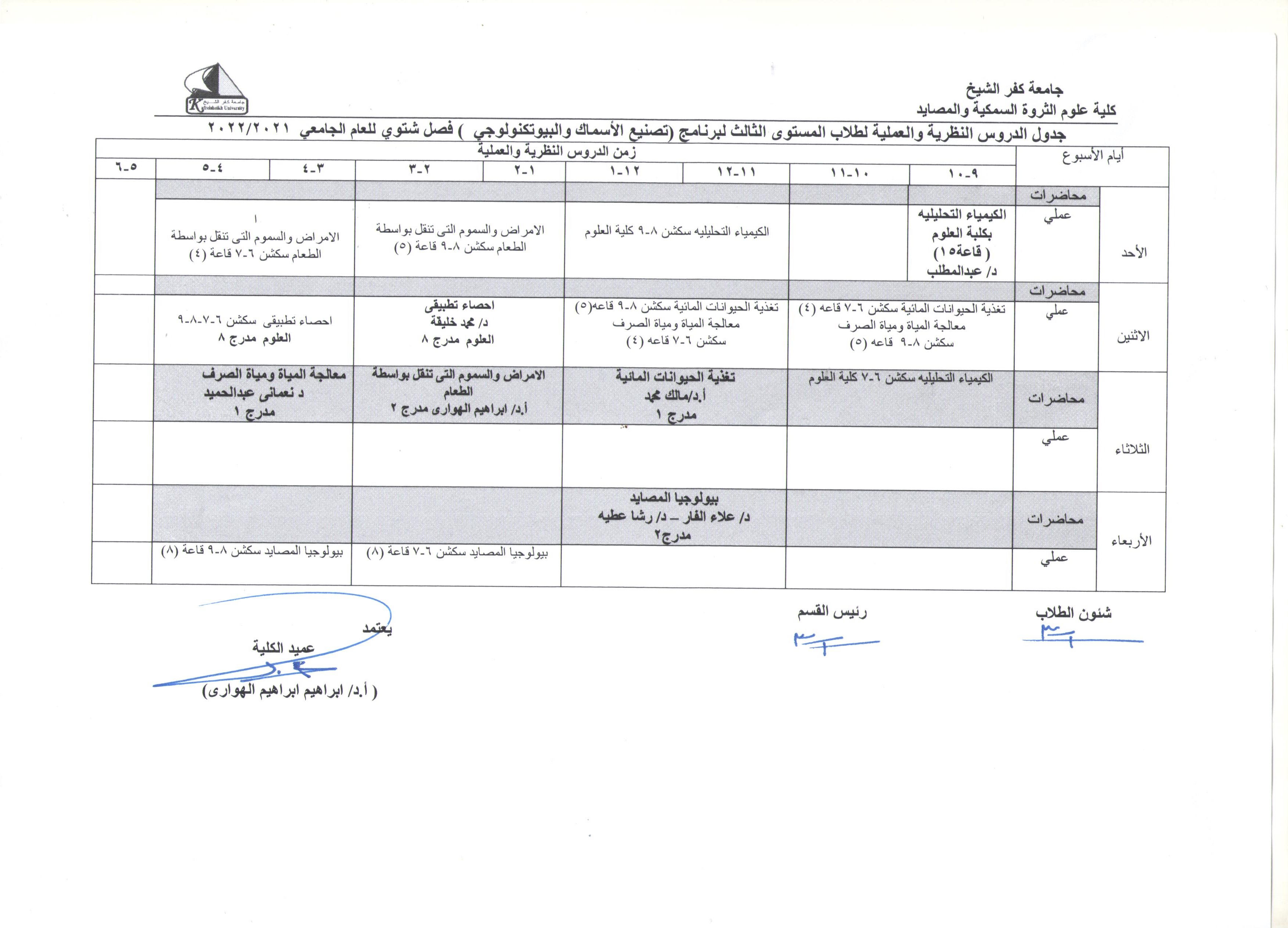 جدول المستوي الثالث قسم الاستزراع للفصل الشتوي للعام الجامعي 2021/2022