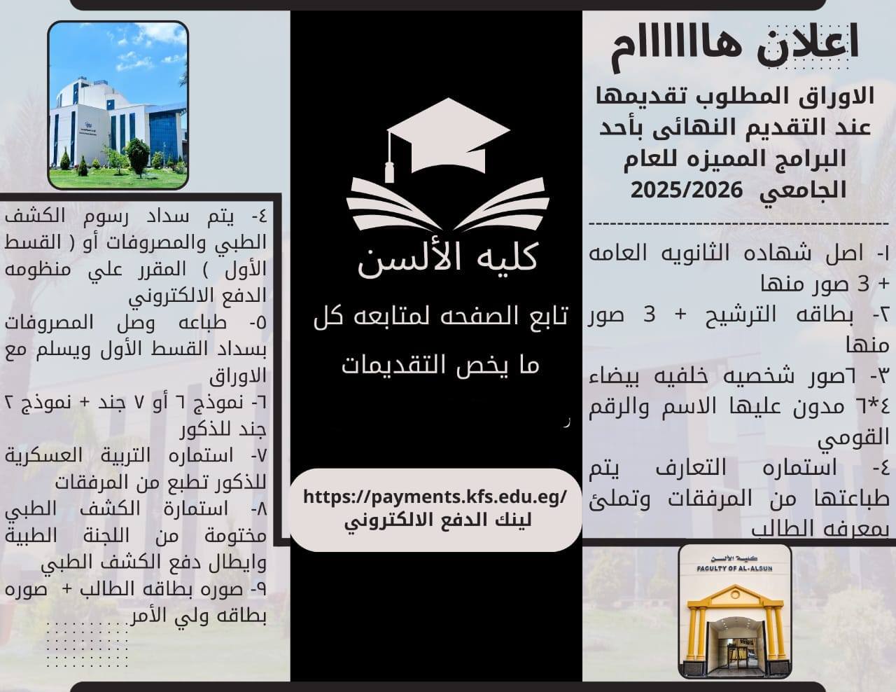 يتم فتح باب الحجز للقبول ببرنامج الترجمة المتخصصة فى اللغة الاسبانية وبرنامج الترجمة المتخصصة فى اللغة الانجليزية للعام الجامعى 2026/2025 م يوم الثلاثاء الموافق 19/8/2025 وييكون الحجزعن طريق تقديم الطالب صورة من شهادة الميلاد + صورة من شهادة الثانوية العامة + صورة من بطاقة الترشيح النهائية ودفع مبلغ ال 1000 جنية رسم تحويل + 300 رسم سحب المظروف +100طابع والتعامل بالفيزا ويتم قبول الطلاب وفقا للحد الادنى للقطاع وسيكون التقديم وفقا لاستيعاب كل برنامج على ان يقوم الطالب بطباعة الاوارق التالية وملاها وتقديمها مع اضغط هنا لتحميل الاوراق المطلوبة