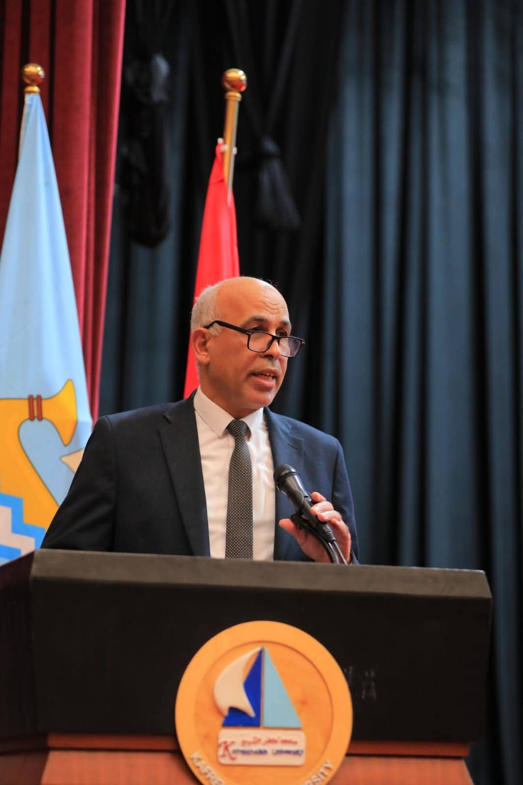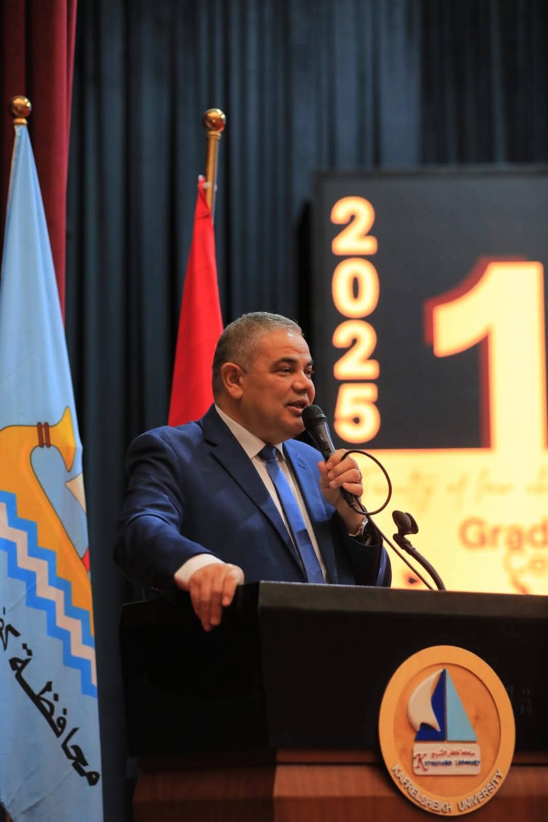 خلال كلمته، أعرب الدكتور إسماعيل إسماعيل إبراهيم، القائم بعمل رئيس جامعة كفر الشيخ، عن سعادته الغامرة بهذه المناسبة التاريخية، مشيراً الي أن هذا اليوم نشهد ميلاد جيل جديد من خريجي كلية الحقوق بجامعتنا، جيل نحمل له كل الأمل في أن يكون نموذجًا للالتزام والتميز في خدمة العدالة والوطن. فهذه الدفعة الذهبية تمثل ثمرة جهد أساتذتنا الأجلاء وإصرار طلابنا المجتهدين، ونحن على يقين بأنهم سيكونون سفراء مشرفين للجامعة في كل مواقع العمل.