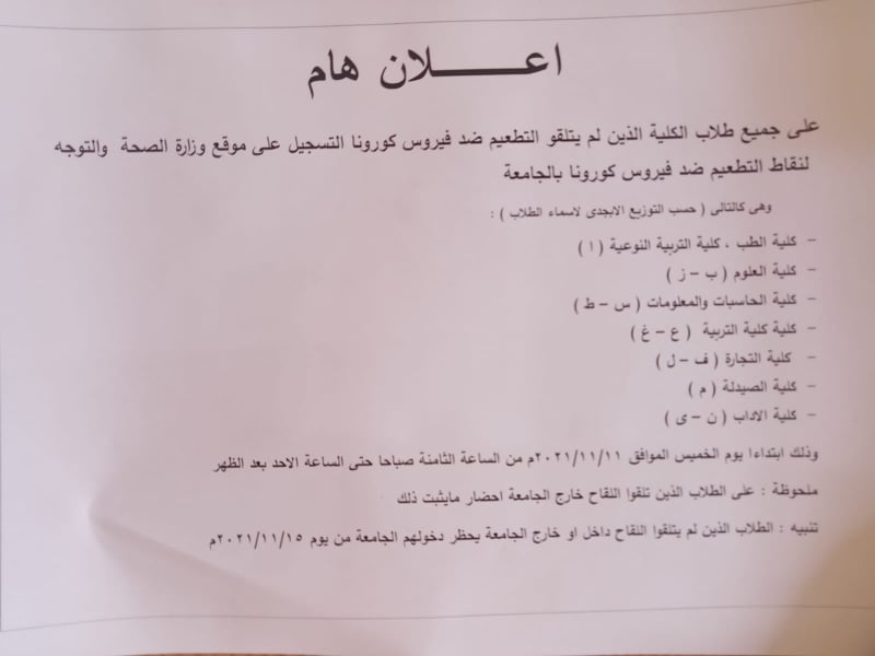 اعلان هام..على الطلبة الذين لم يتلقو التطعيم.....
