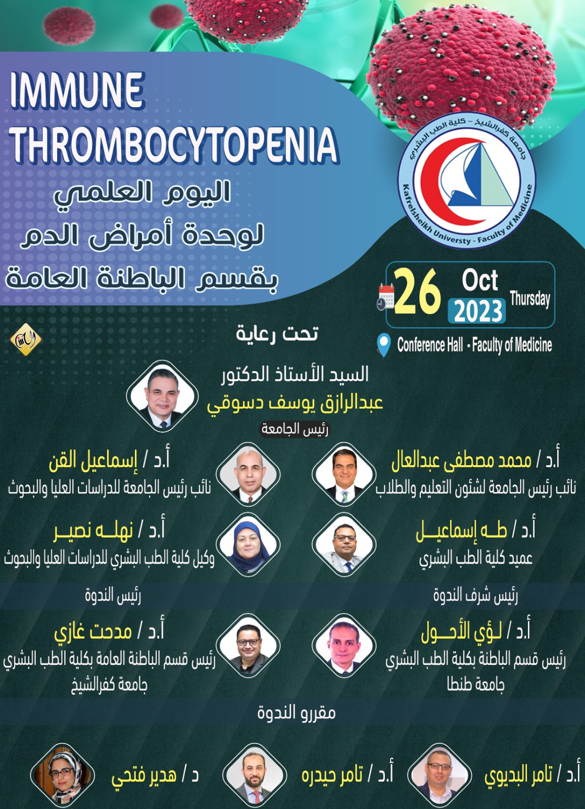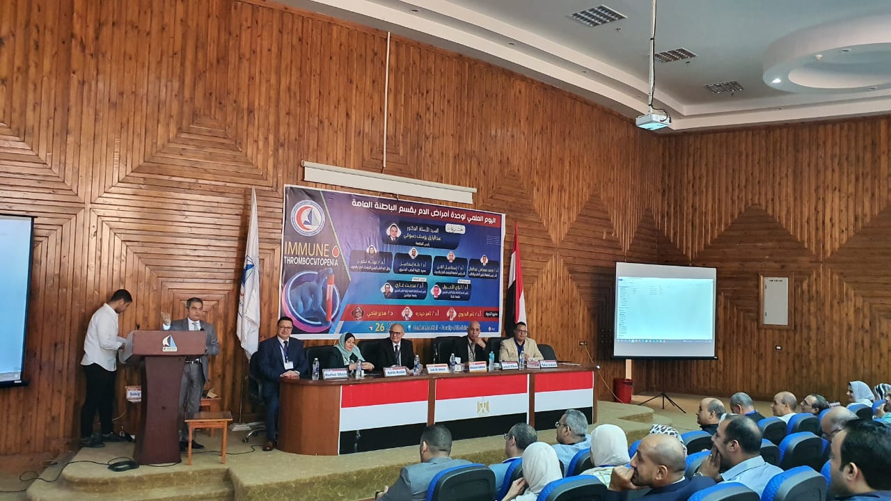 اقيم الخميس 26 من اكتوبر الجاري فعاليات اليوم العلمي لقسم الأمراض الباطنة ومناقشة كل ما هو جديد في تشخيص وعلاج النقص المناعي للصفائح الدمويه ITP