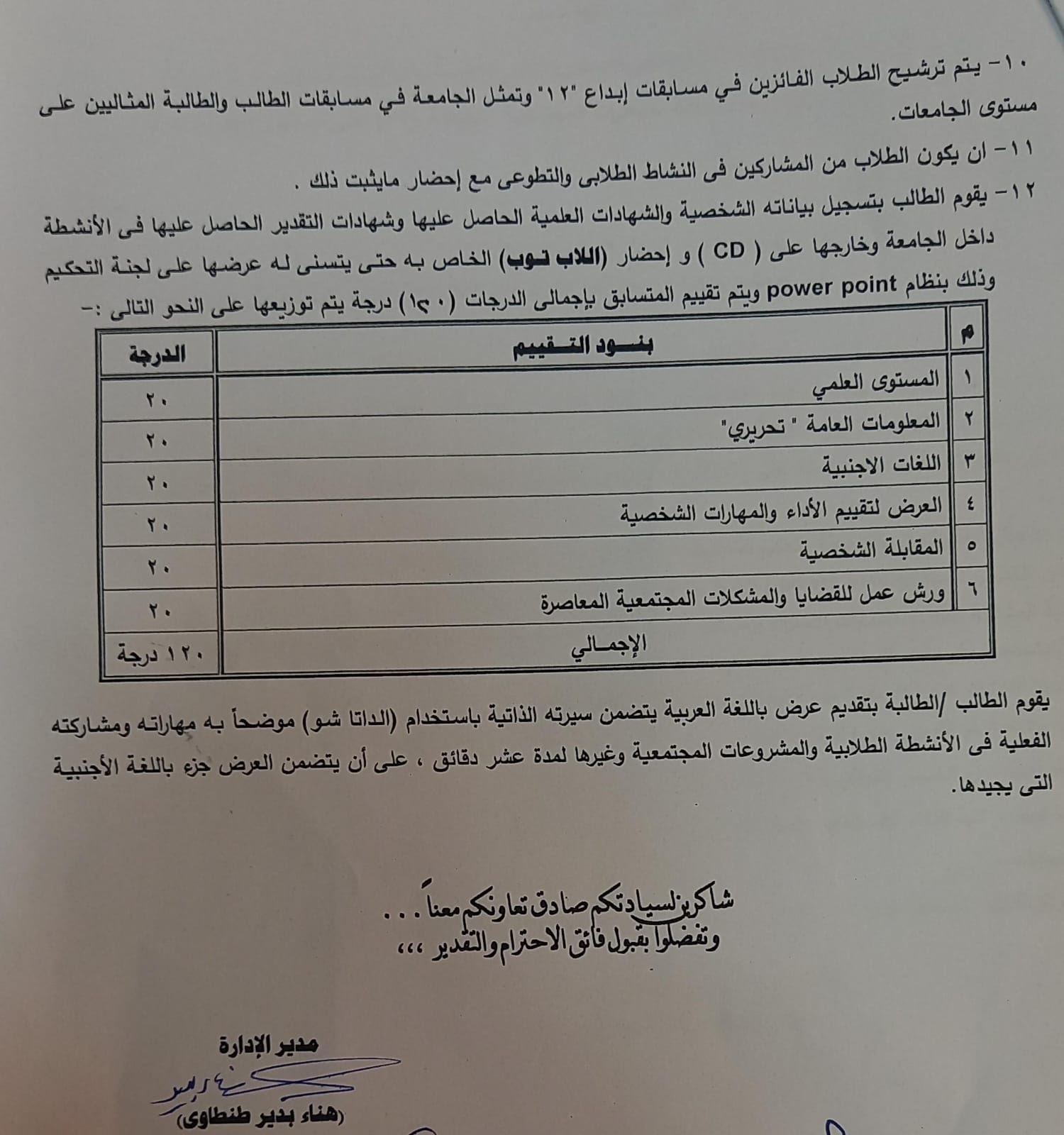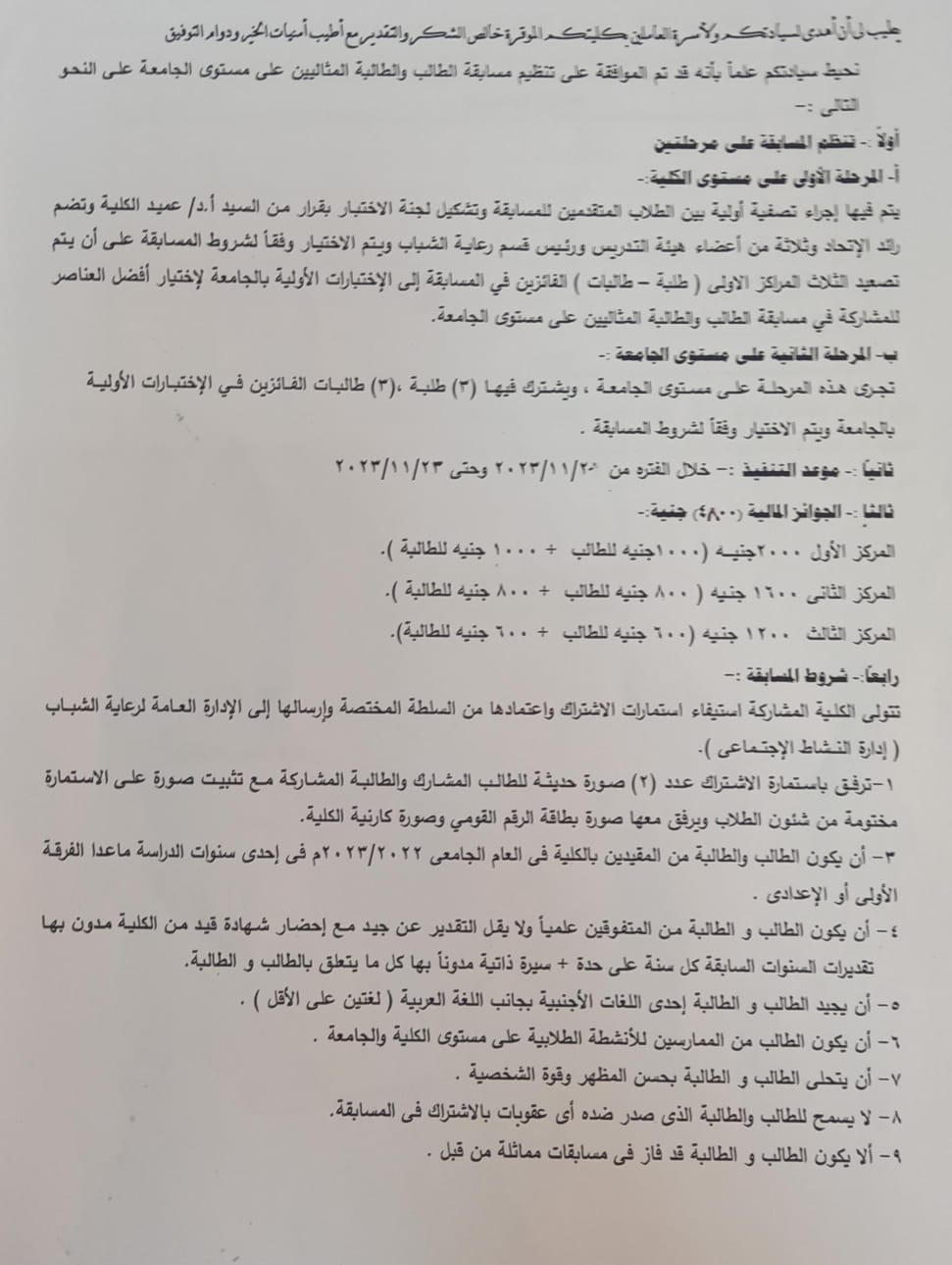 مسابقة الطالب والطالبة المثاليين علي مستوي الجامعه للعام الجامعي2023/2024