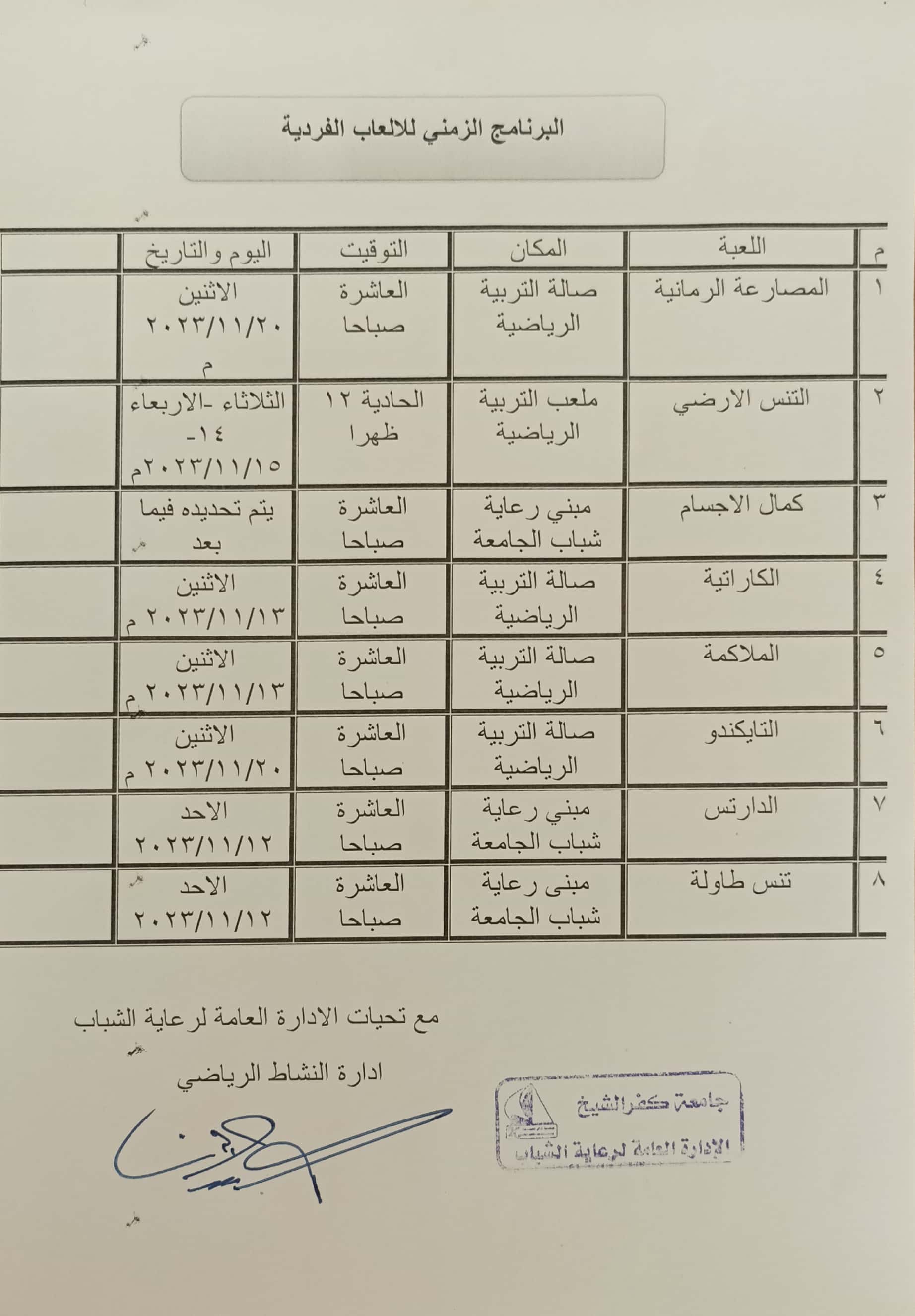 البرنامج الزمني للالعاب الفردية بالجامعة