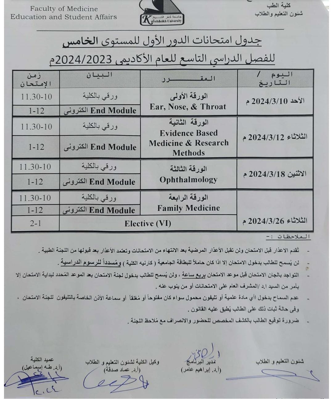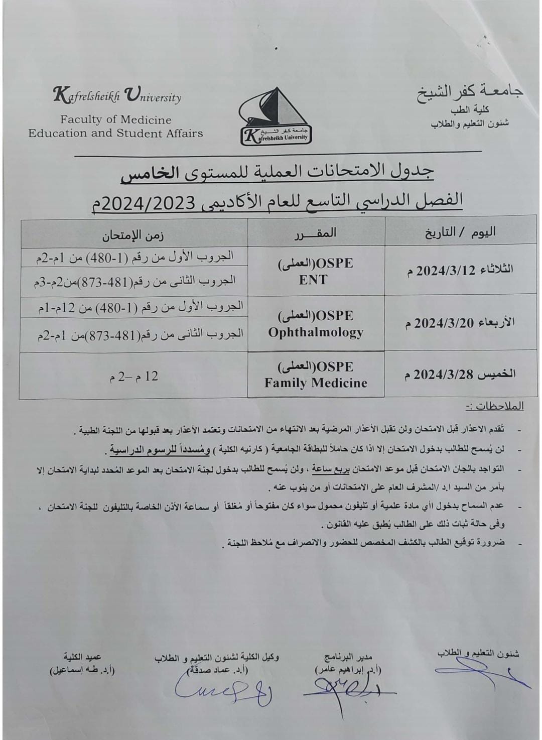 جدول الامتحانات العملية للمستوي الخامس العام الجامعي 2023/2024