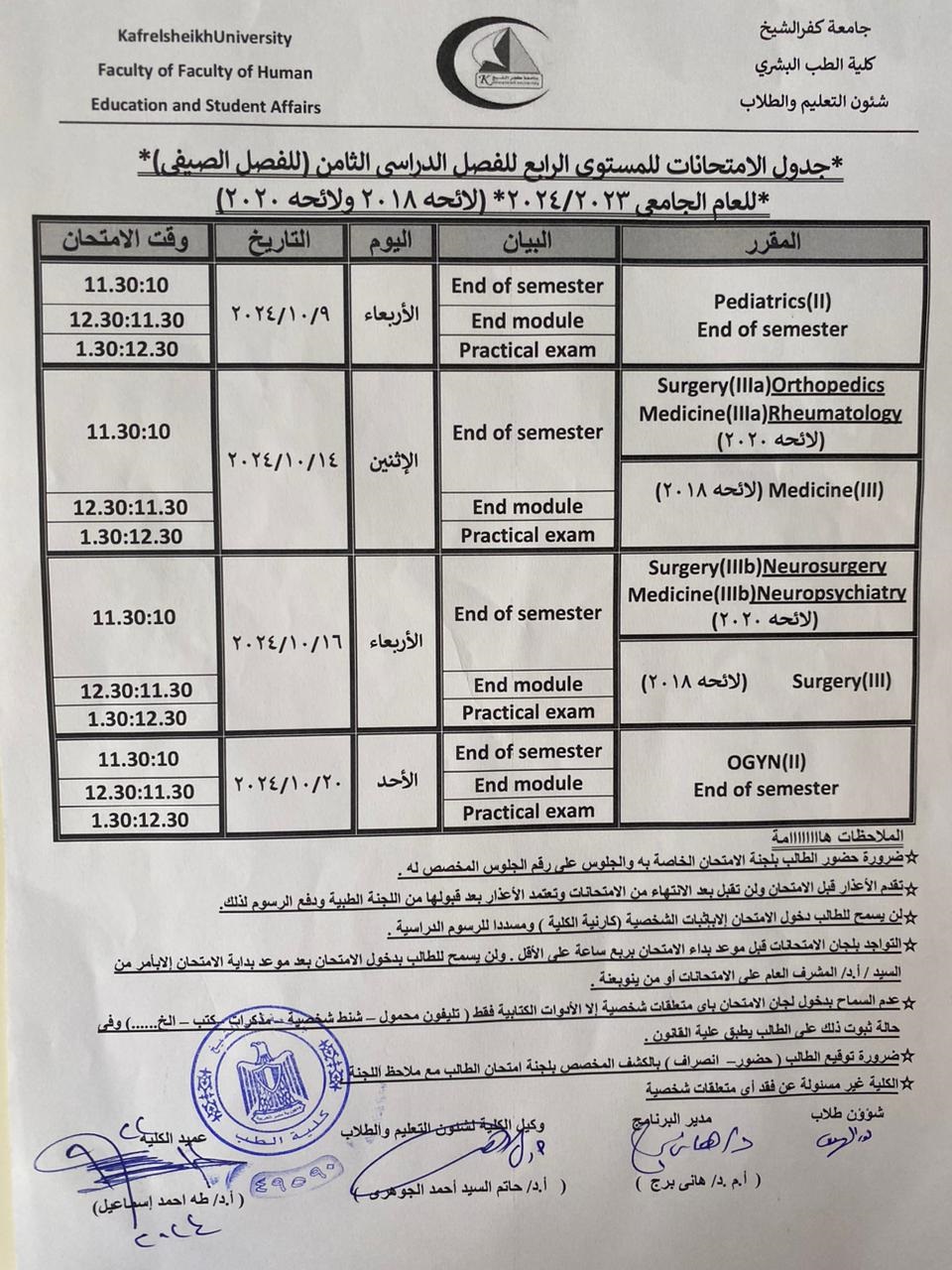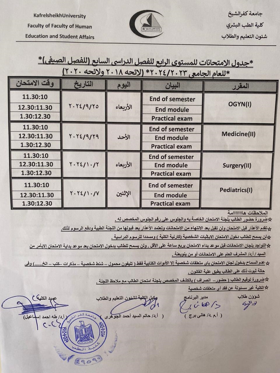 جدول الامتحانات للمستوي الرابع للفصل الصيفي 2023/2024