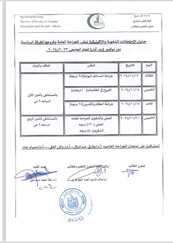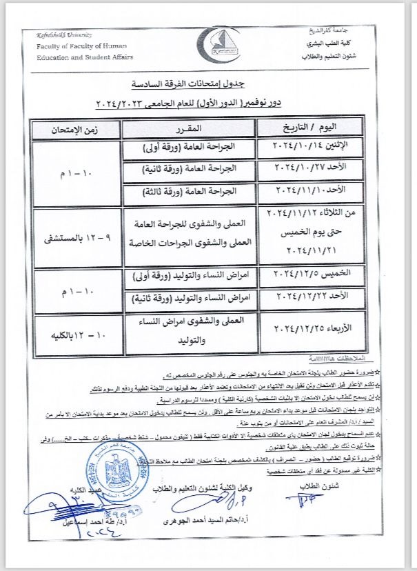 جدول امتحانات الفرقه السادسة دور نوفمبر للعام الجامعي 2023/2024