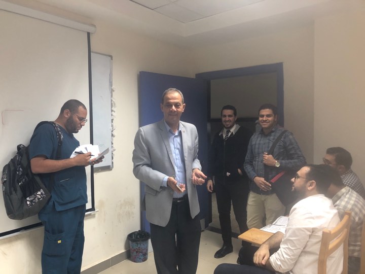والاستاذ الدكتور/أسامه العجمي وكيل الكليه لشئون التعليم والطلاب امتحاانات العملي لماده الجراحه العامه وقد أثني سيادته علي حسن تنظيم قسم الجراحه لامتحانات العملي بنظام OSCE STATION
