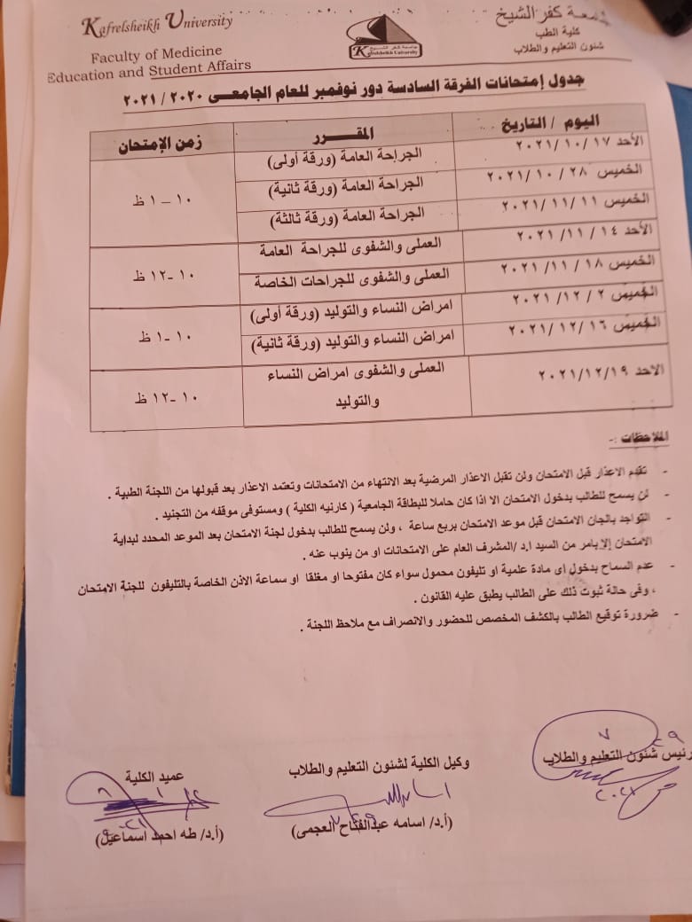 جدول امتحانات الفرقه السادسه دور نوفمبر للعام الجامعي 2020/2021