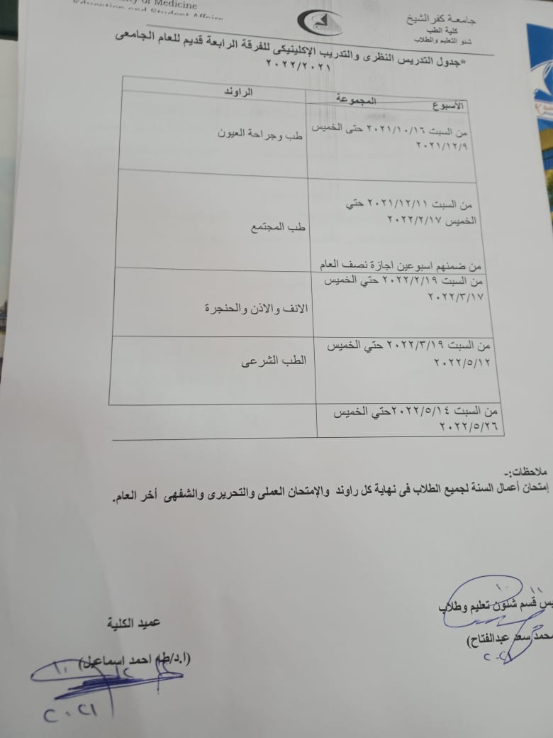 جدول التدريس النظري والتدريب الاكلنيكي للفرقه الرابعة قديم للعام الجامعي 2021-2022