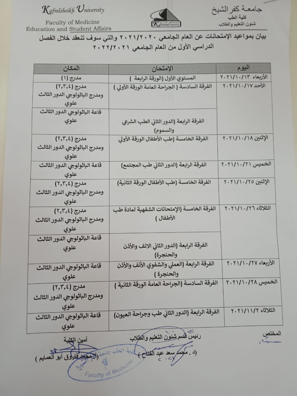 بيان بمواعيد الامتحانات عن العام الجامعي 2020-2021 والتي ستنعقد خلال الفصل الدراسي الاول للعام الجامعي 2021-2022