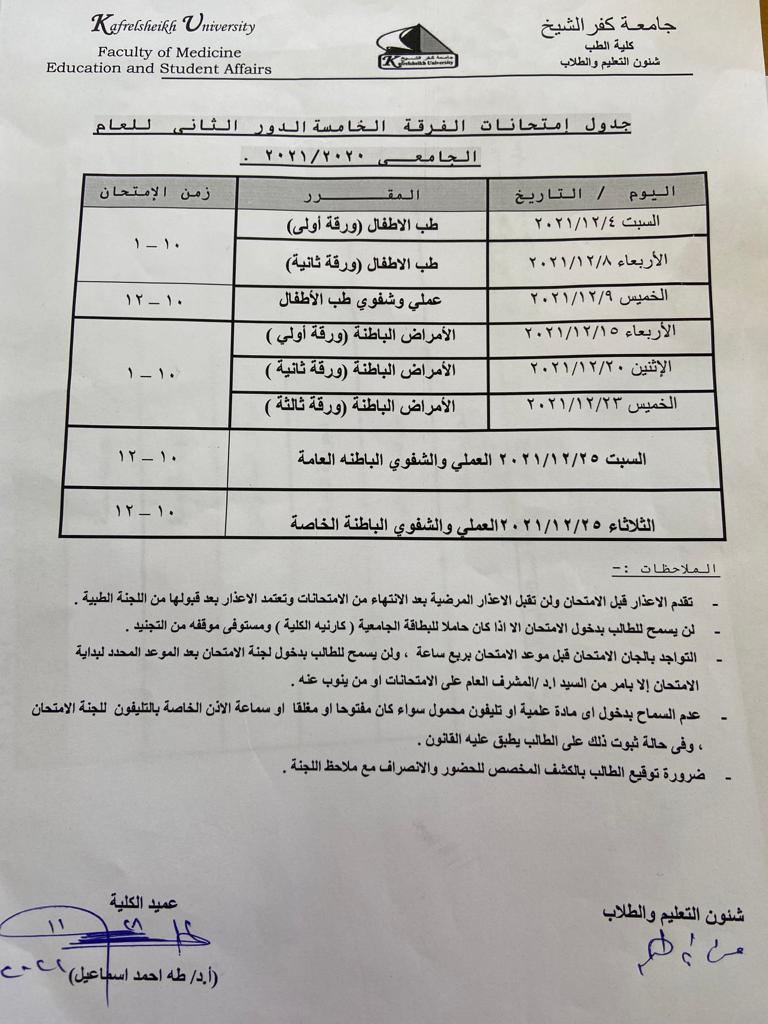 جدول امتحانات الفرقه الخامسه الدور الثاني للعام الجامعي 2021/2022