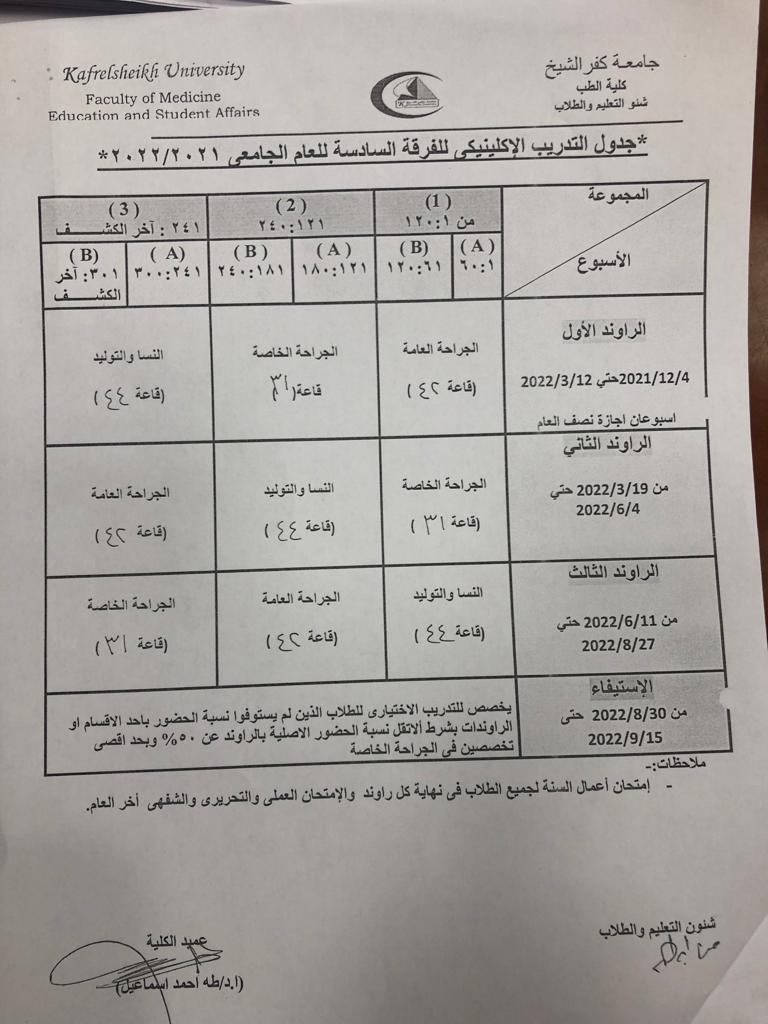 جدول التدريب الاكلينيكي للفرقه السادسة للعام الجامعي 2021/2022