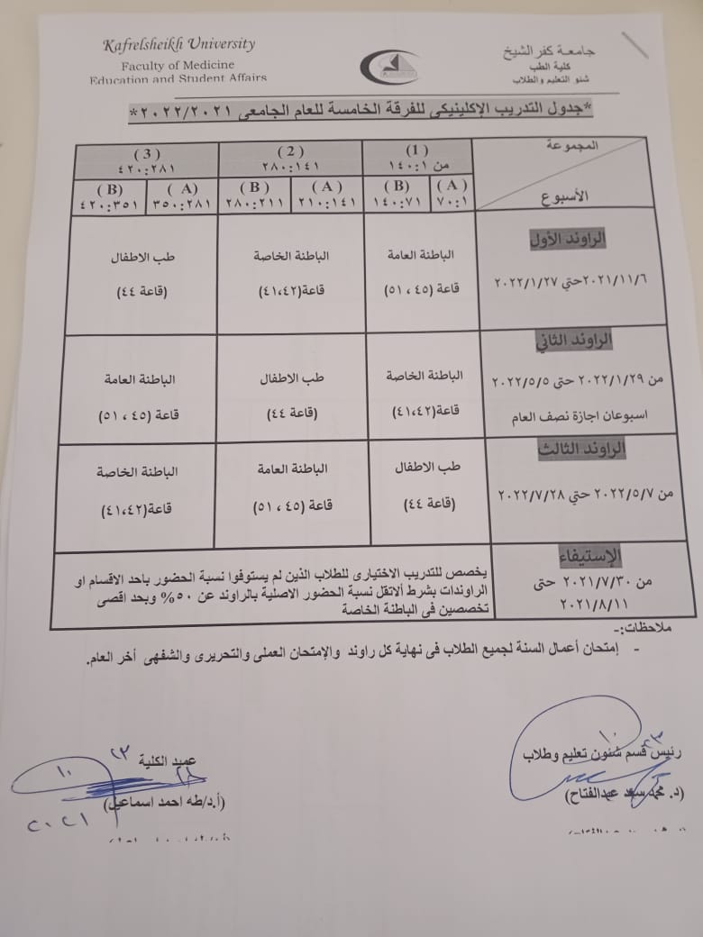 جدول التدريب الاكلينيكي للفرقه الخامسة للعام الجامعي 2021/2022