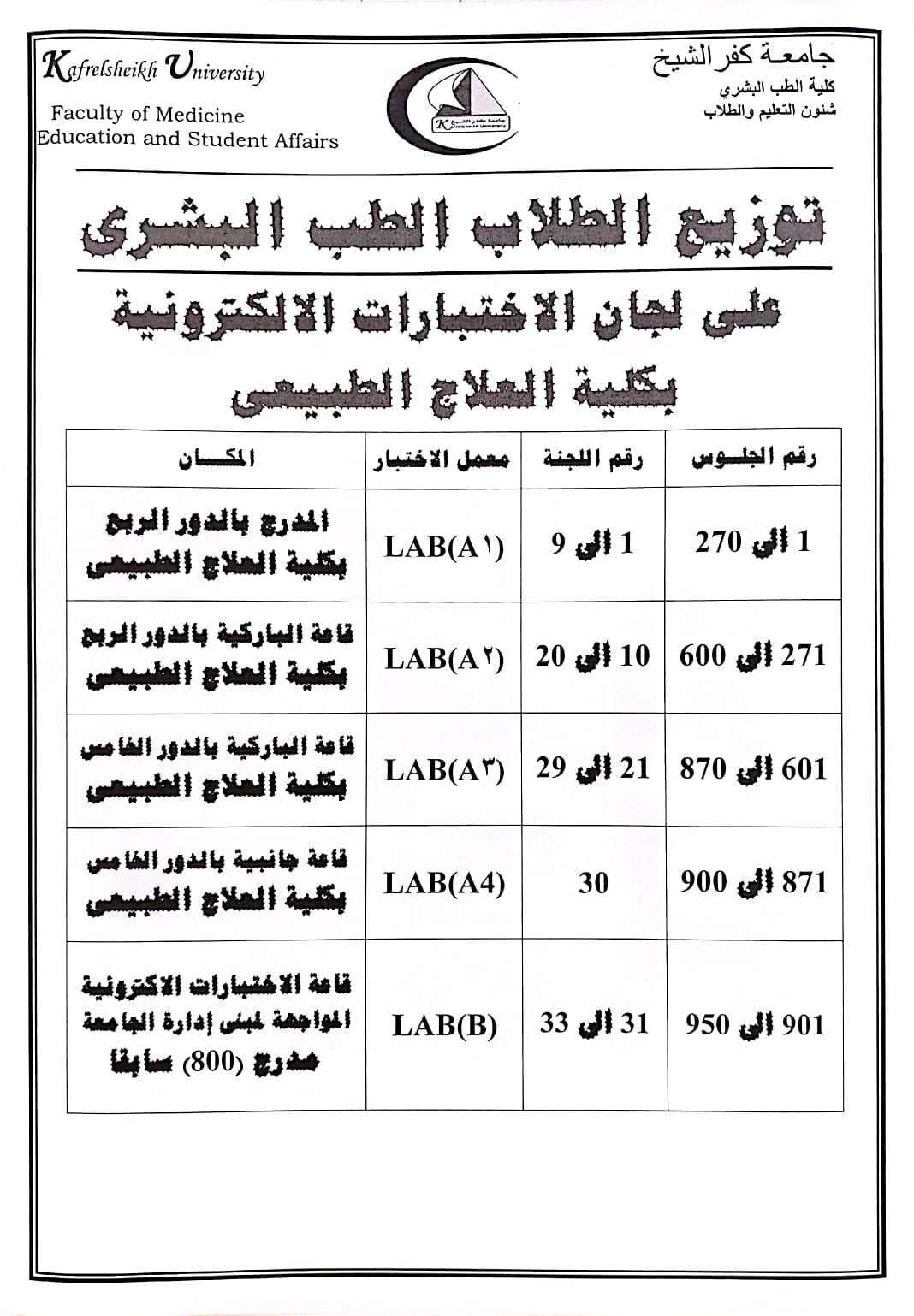 توزيع الطلاب علي لجان الاختبارات الالكترونية بكلية العلاج الطبيعي