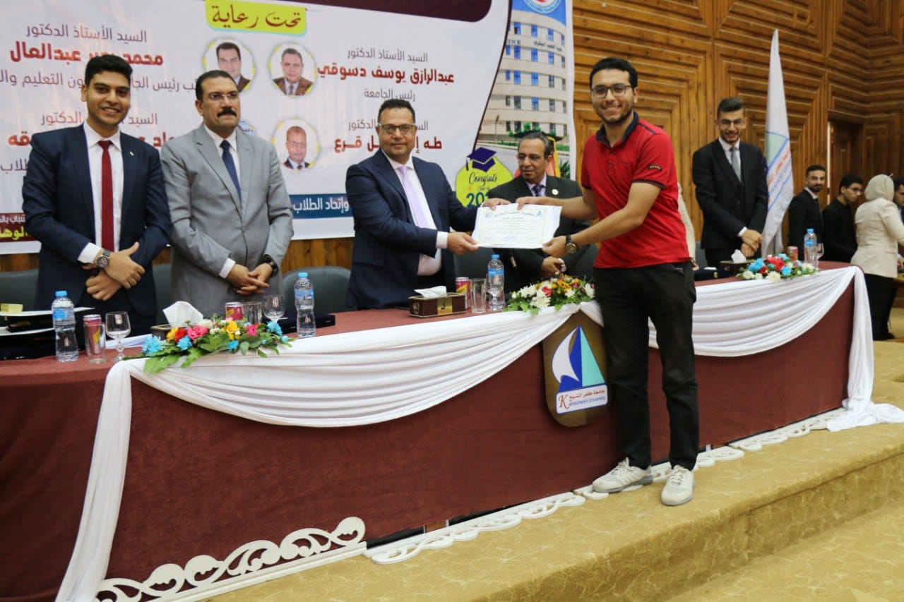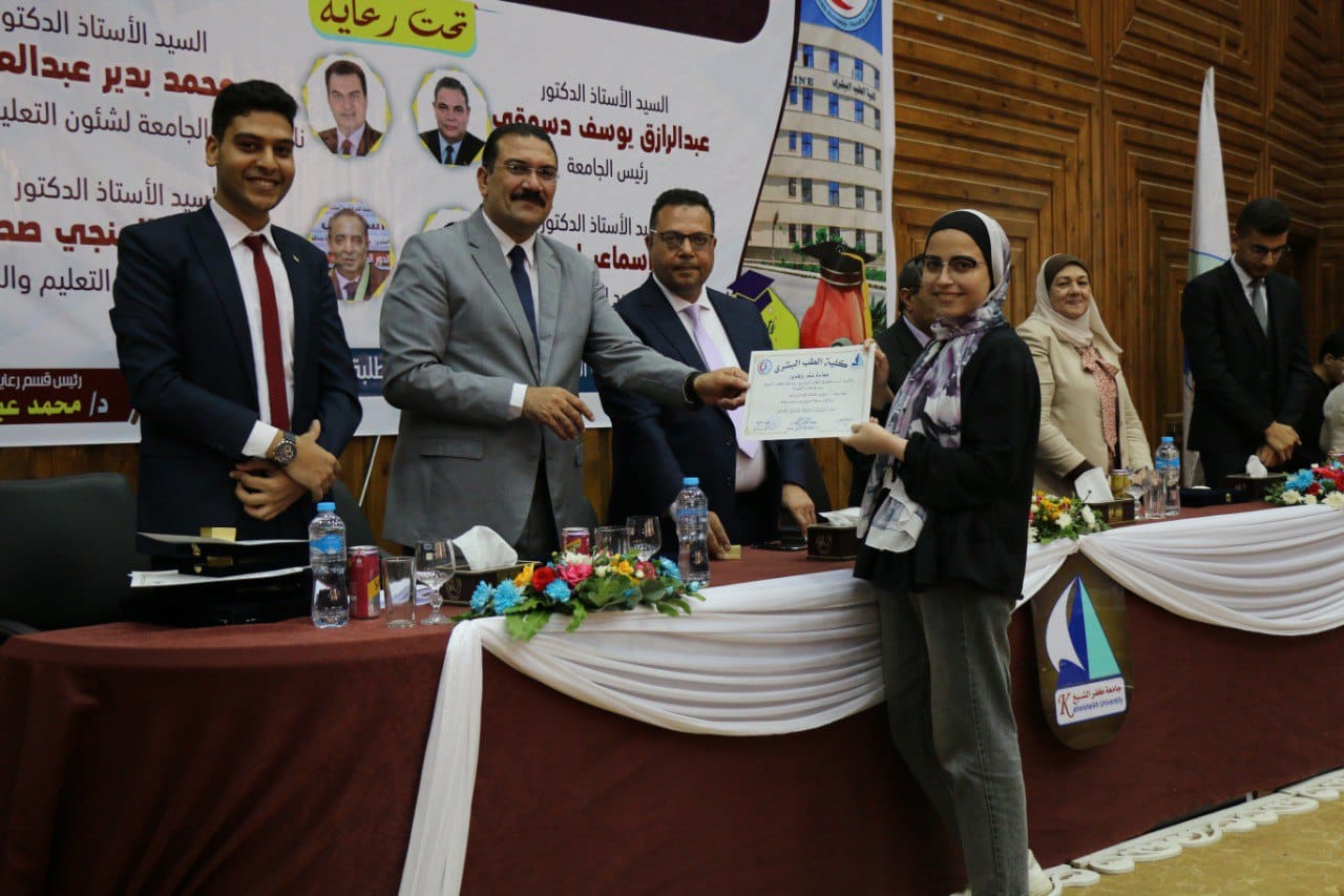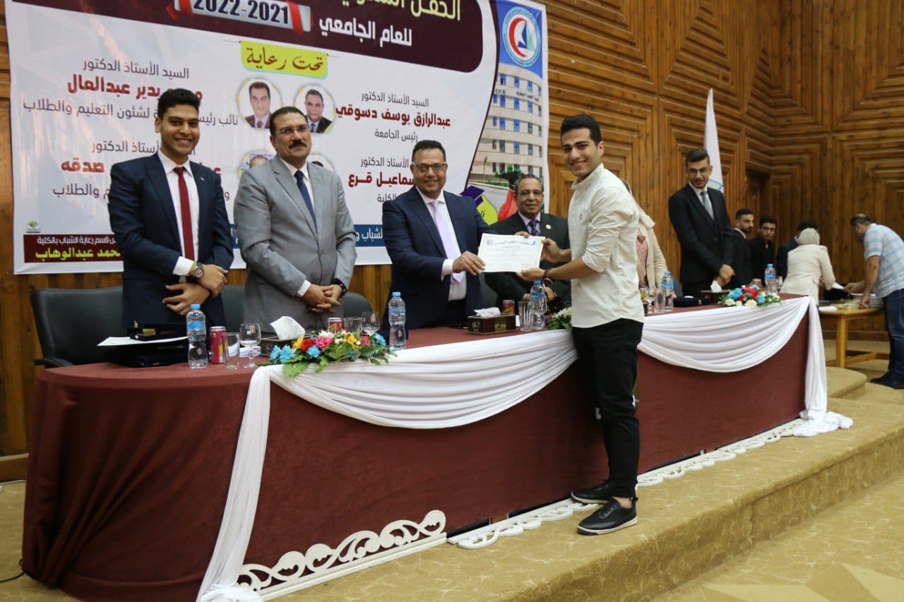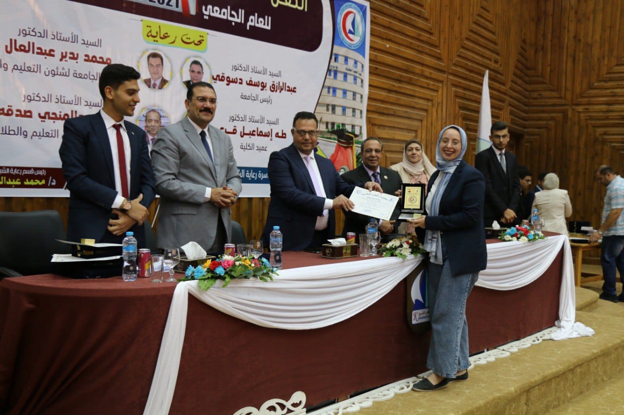 حيث تم تكريم رئيس اتحاد الطلاب/ محمد رأفت النجار ومجلس الاتحاد لعام 2021/ 2022 وتم تكريم الفائزين بالمراكز الأولى في الأنشطة الطلابية علي مستوي الجامعة والكلية