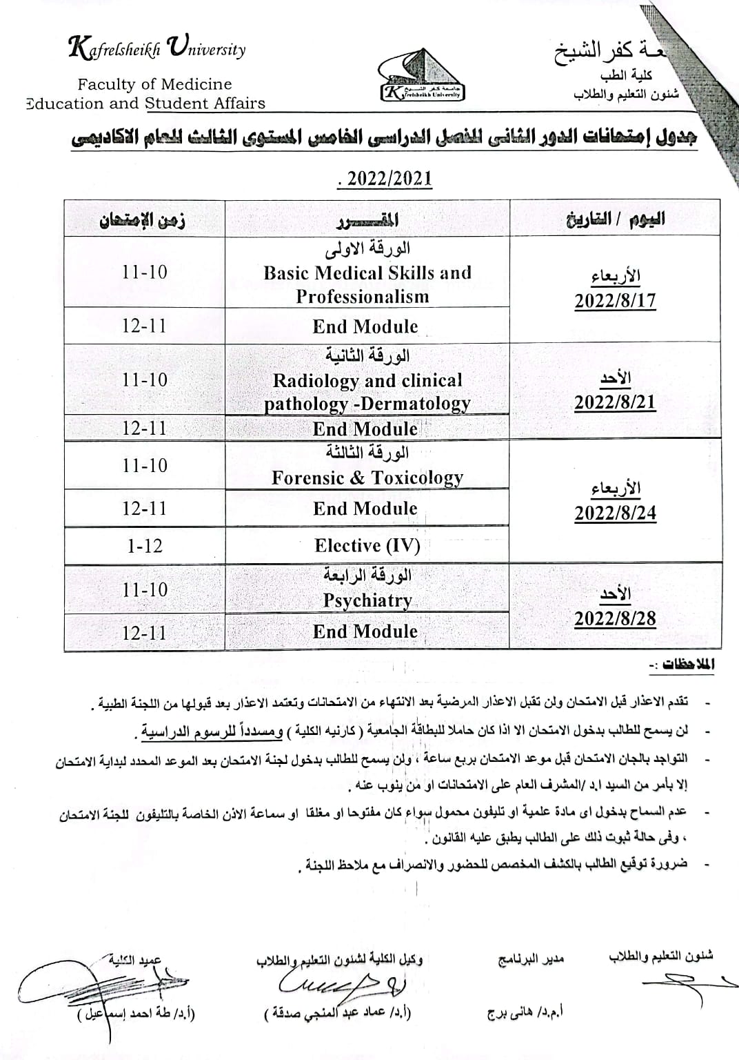 جدول امتحانات الدور الثاني المستوي الثالث للعام الاكاديمي 2021/2022