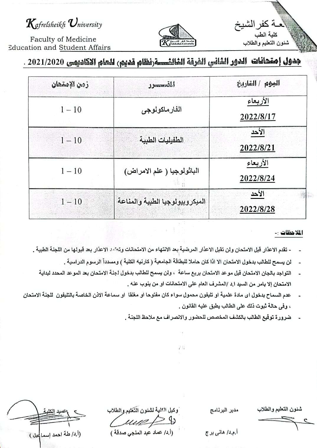 جدول امتحانات الدور الثاني الفرقه الثالثه نظام قديم للعام الاكاديمي 2020/2021