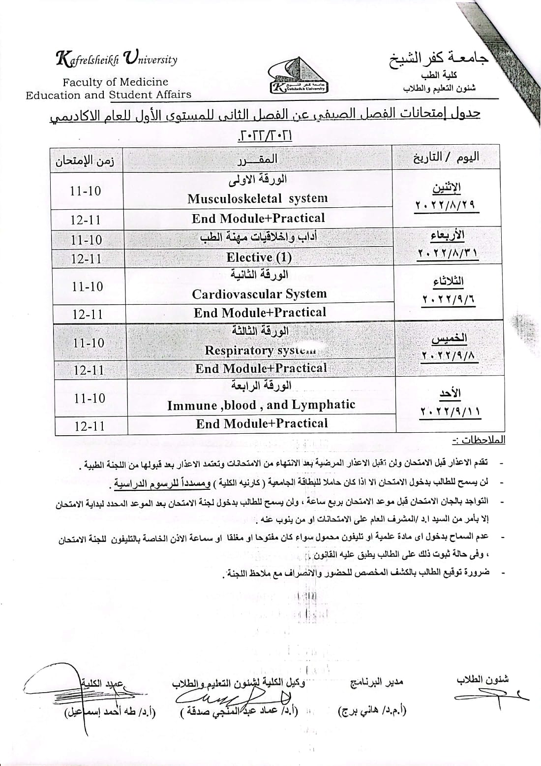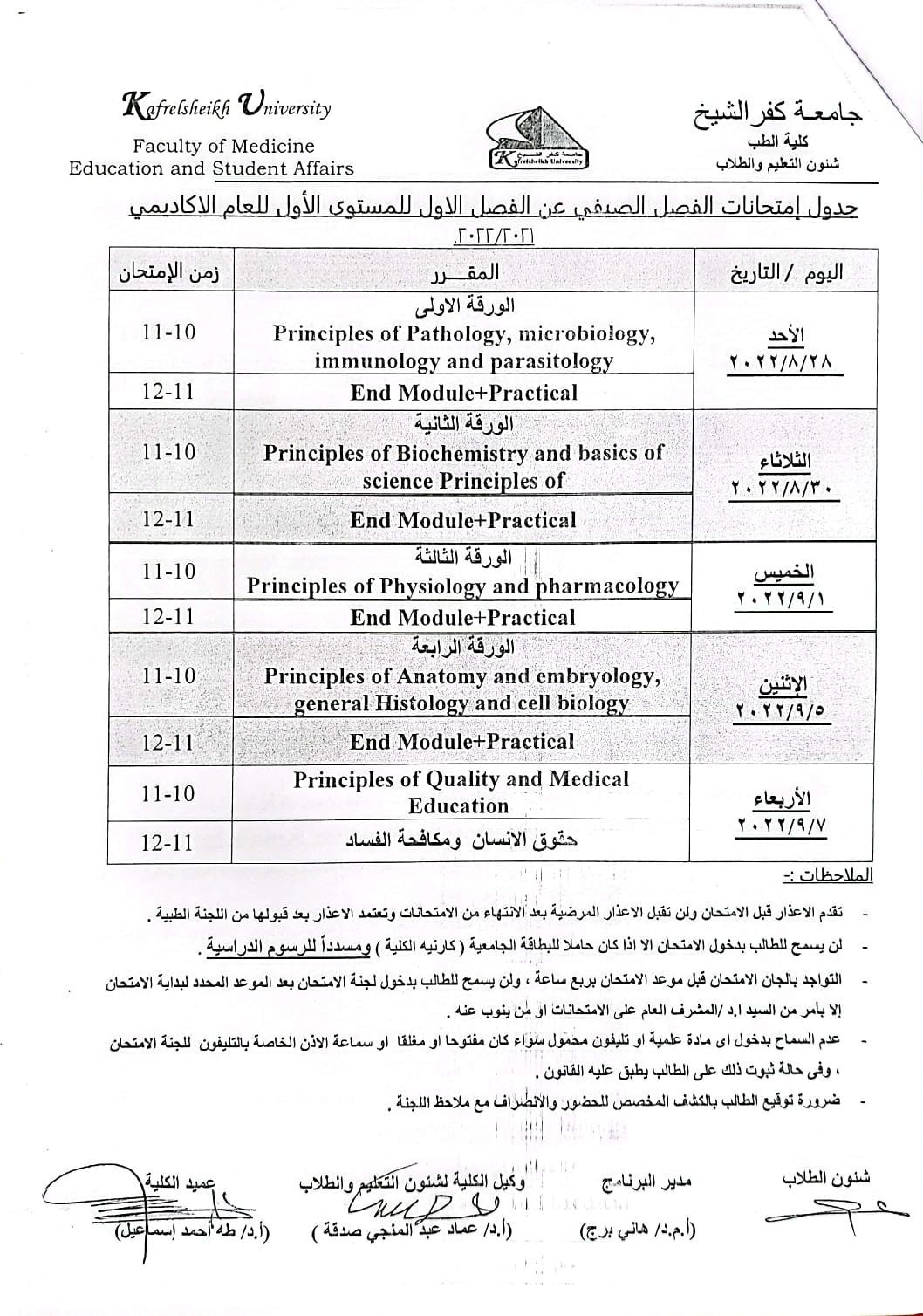 جدول امتحانات الفصل الصيفي المستوي الاول للعام الاكاديمي 2021/2022