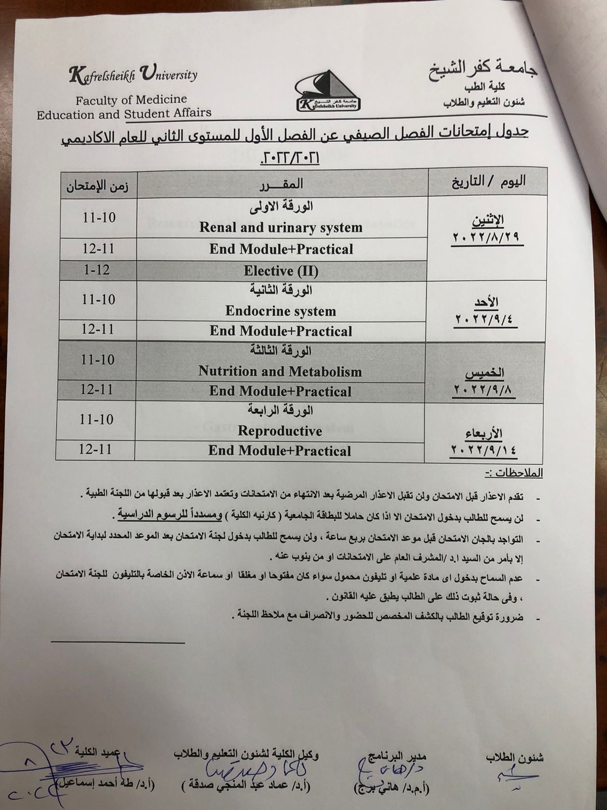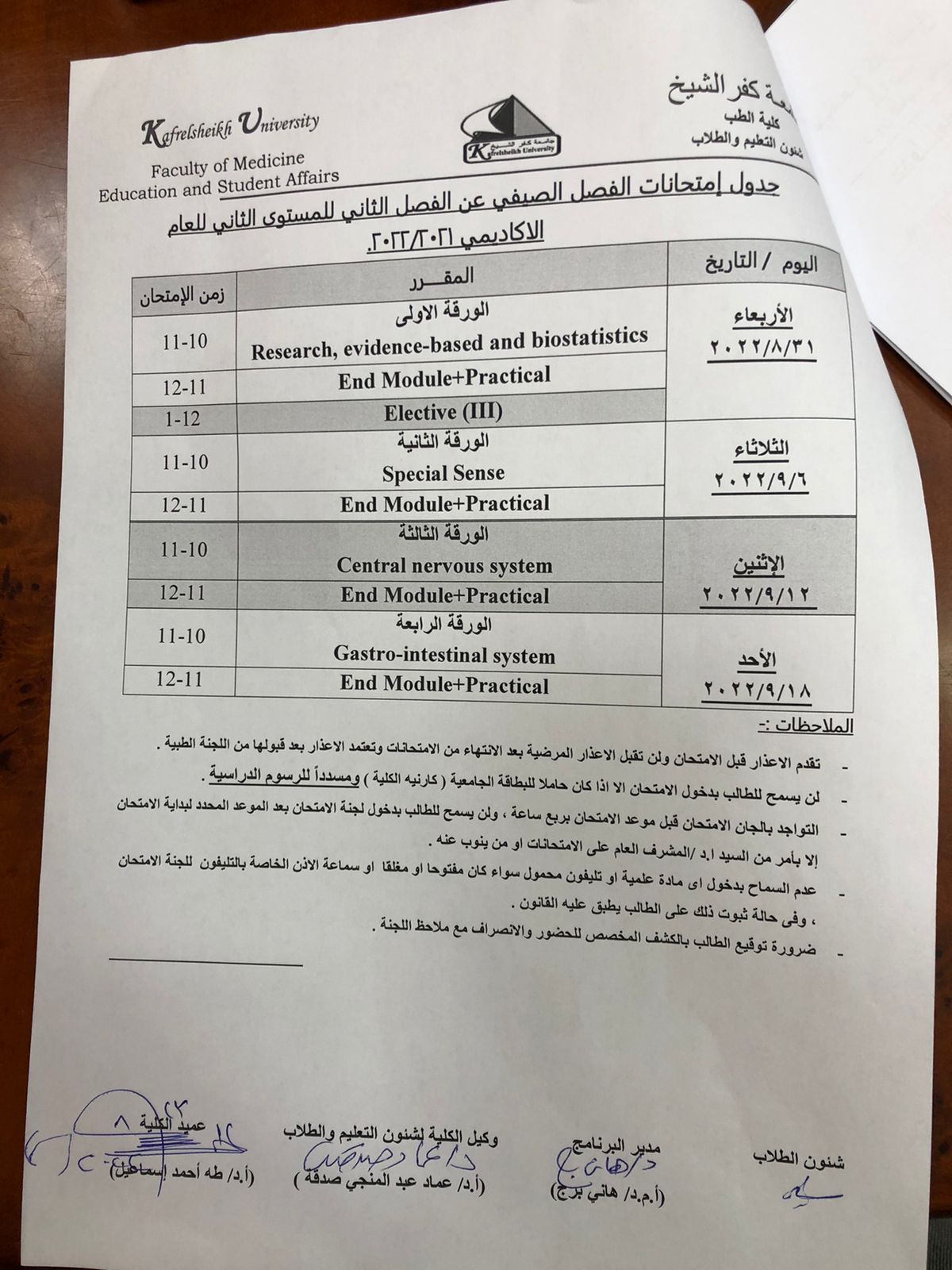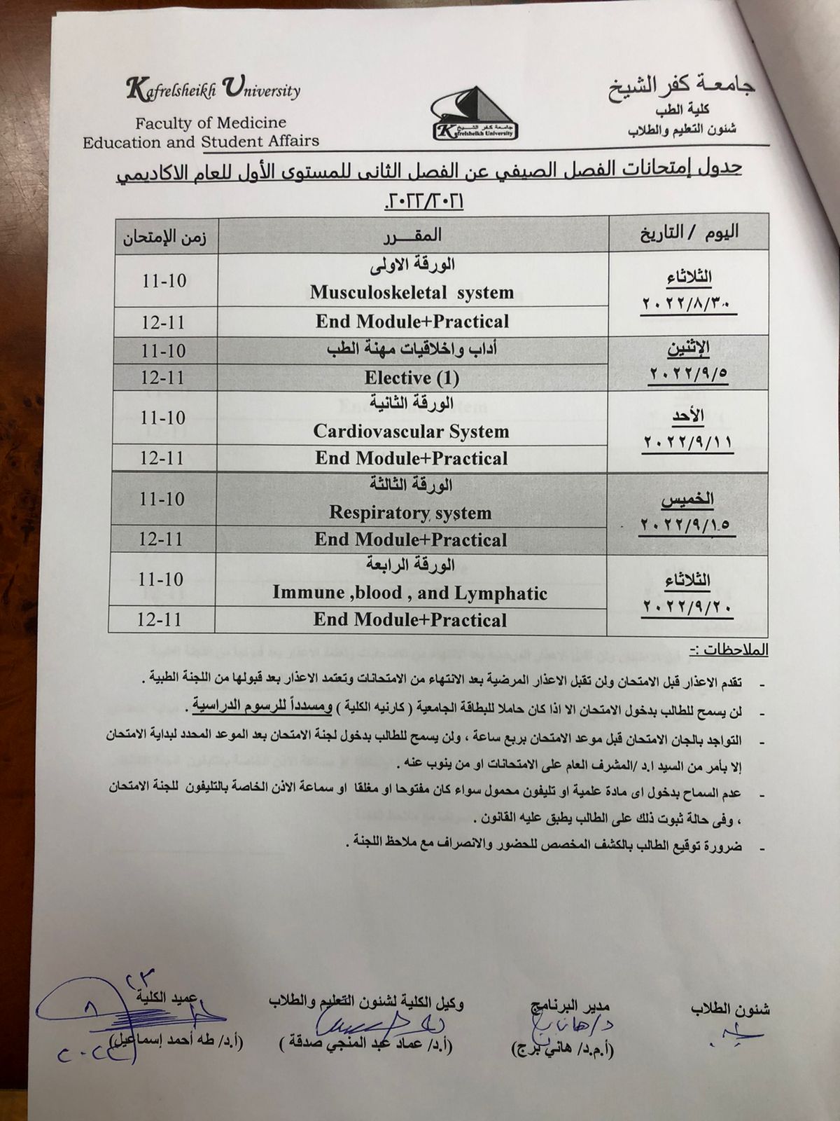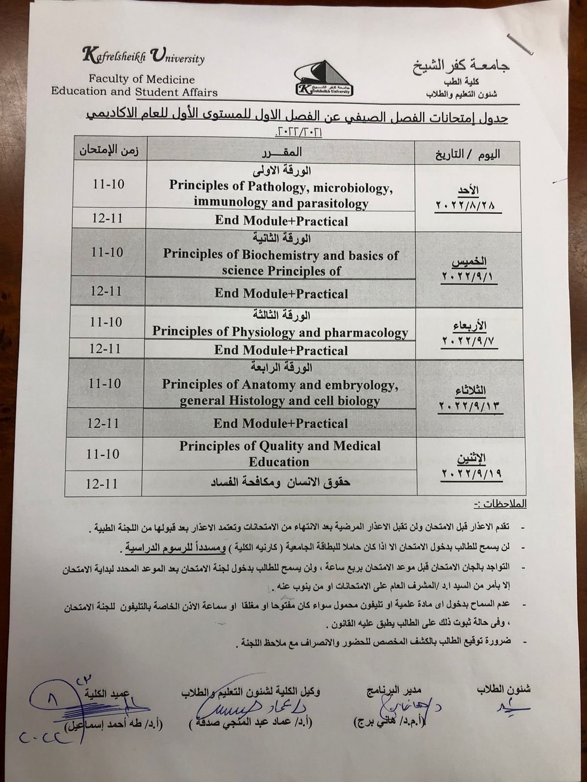 جدول امتحانات الفصل الصيفي للمستوي الاول والثاني للعام الجامعي 2021/2022