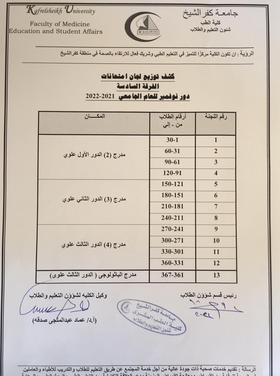 كشف توزيع لجان الفرقه السادسه وارقام الجلوس للعام الجامعي2021/2022