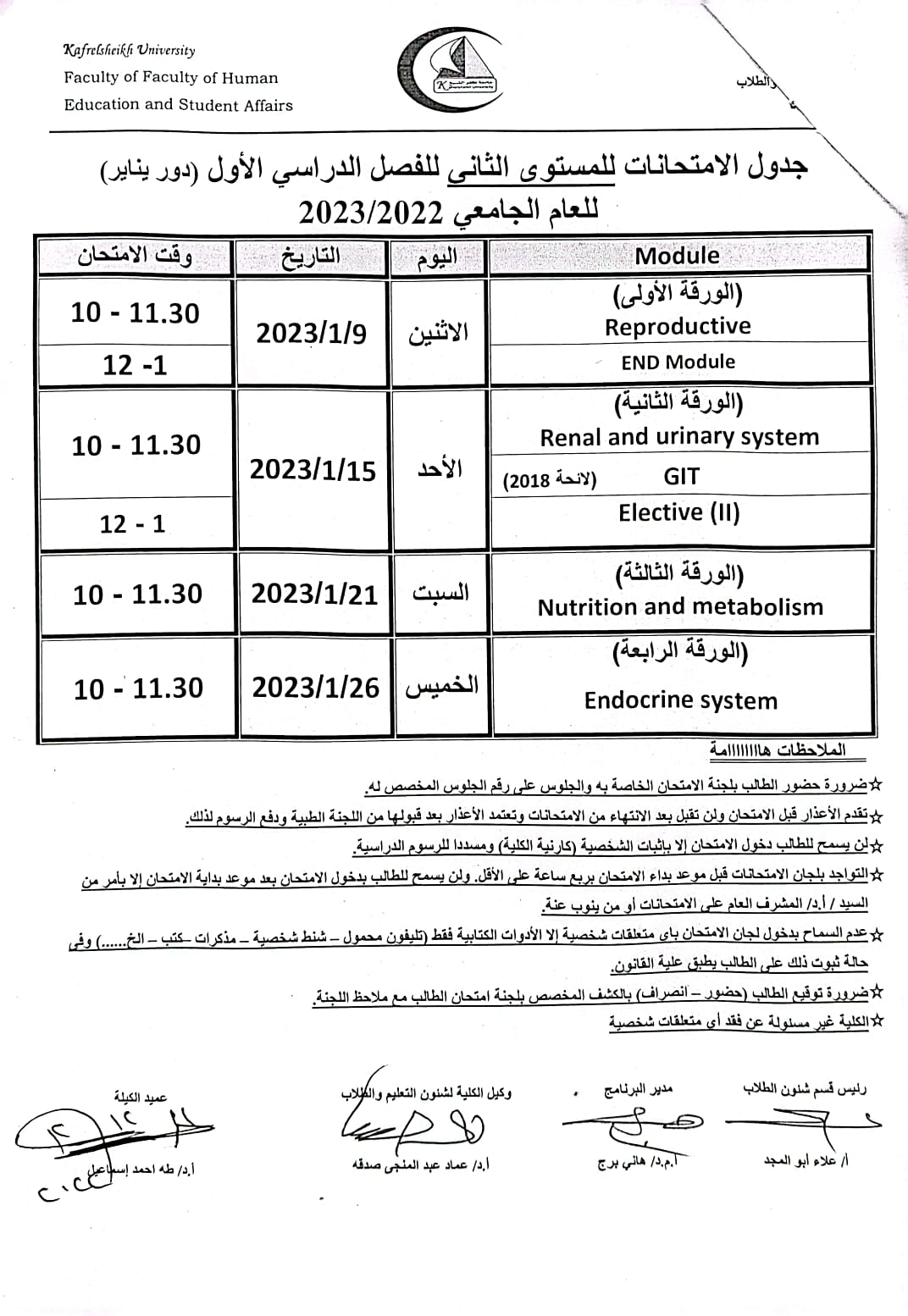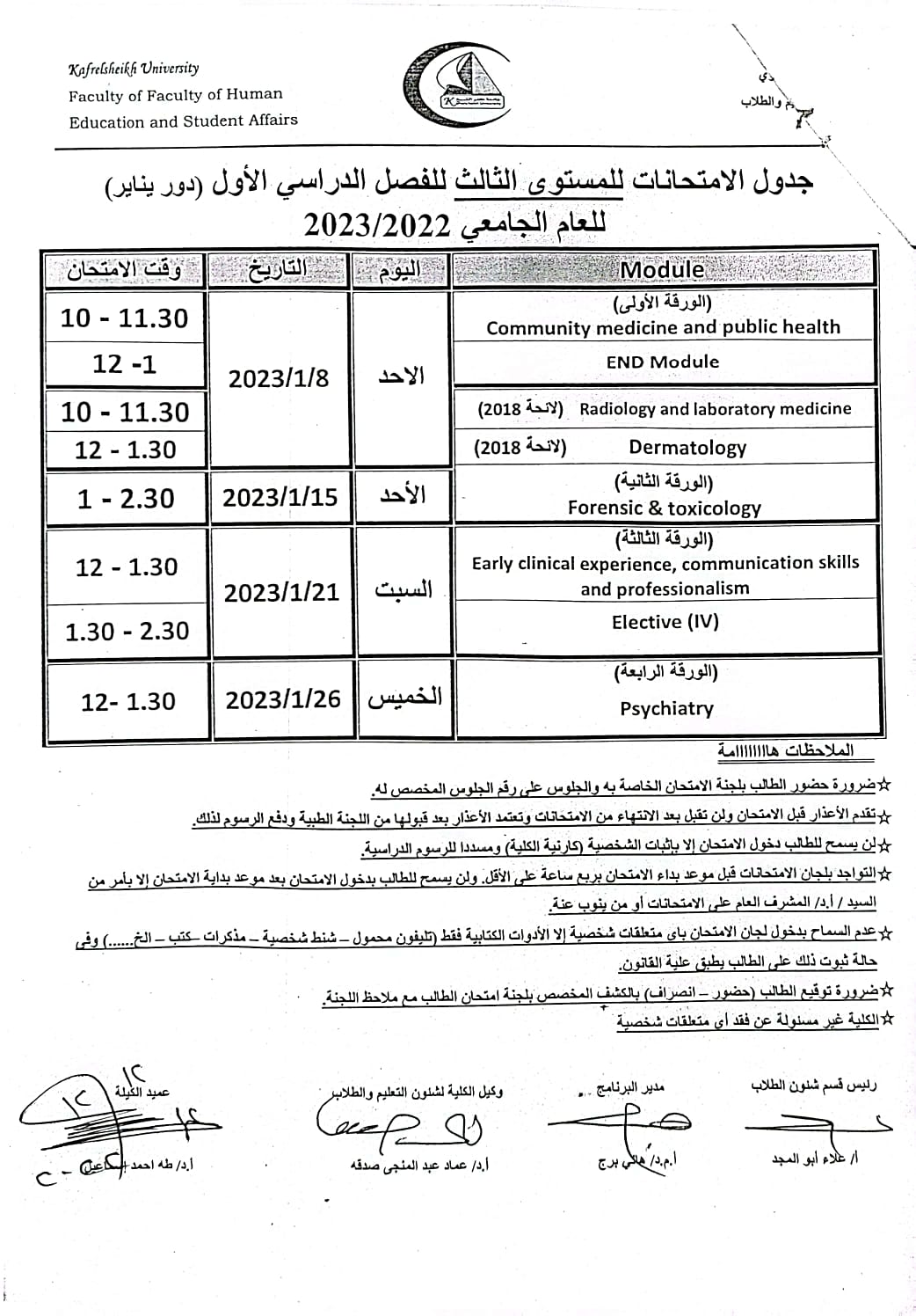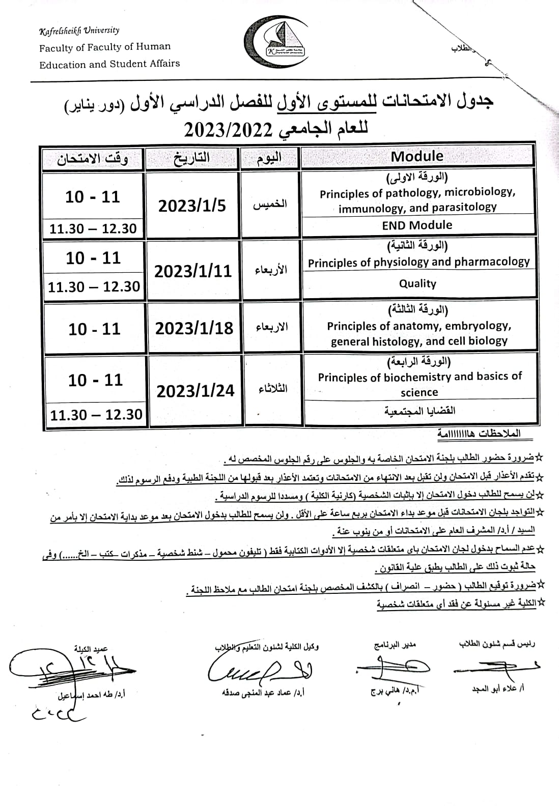 الجداول الامتحانات للفرق الثلاث الاولي الفصل الدراسي الاول للعام الجامعي 2022/2023