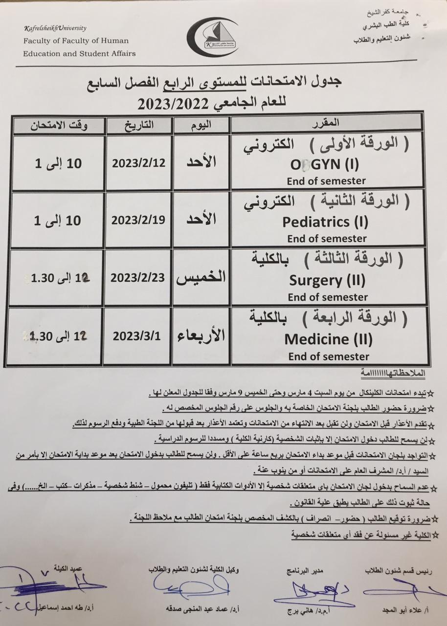 جدول الامتحانات للمستوي الرابع الفصل السابع للعام الجامعي 2023/2022