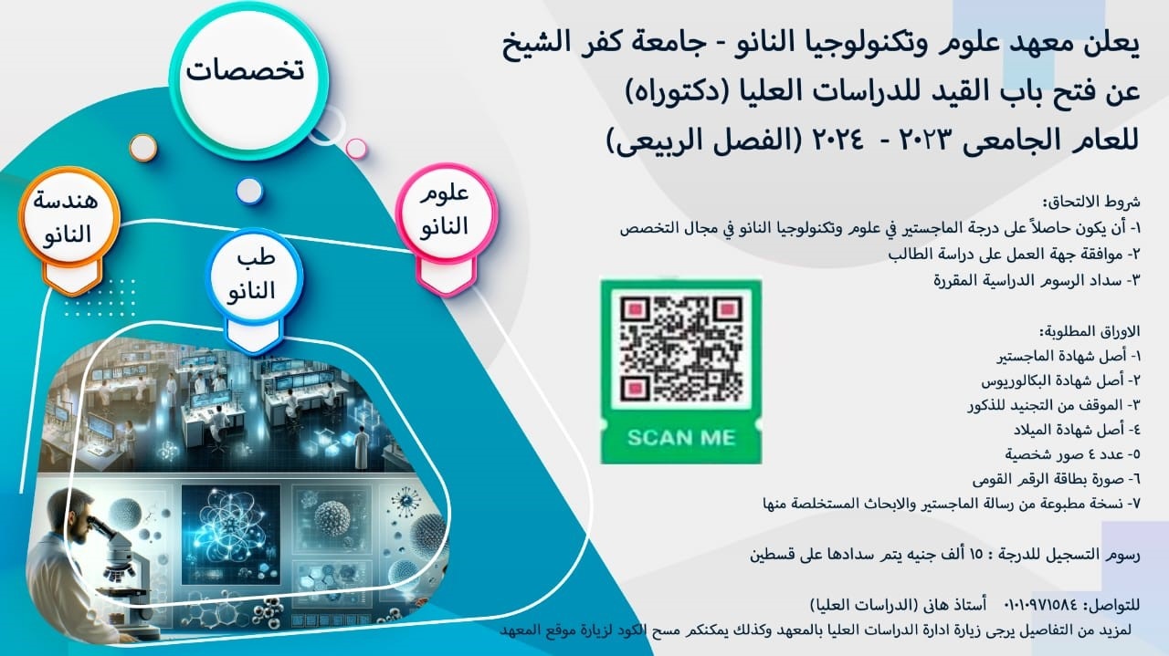 يعلن معهد علوم وتكنولوجيا النانو جامعة كفر الشيخ عن فتح فتح باب القيد للدراسات العليا (دكتوراه) فى الفترة من 1 يناير ولمدة اسبوعين.