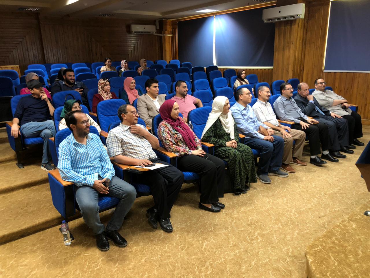ثم استمرت الورشه فى اليوم الاول قرابه الخمس ساعات وقدم الاستاذ الدكتور أحمد فهمي خليهم عدد من المحاضرات التي تهدف الى الإدارة المتكاملة للتخلص من المخلفات الكيميائية الخطرة في المعامل البحثية، الطرق المثلى في التعامل مع المواد الكيميائية من ناحية التخزين وتداولها وشراءها والاستخدام الامن داخل المعامل لحين التخلص من النفايات الناتجة من تلك المواد الكيميائية الخطرة، التدريب على المخاطر المتوقعة من تخزين الكيماويات بشكل خاطئ، آلية شراء الكيماويات بطريقة موفرة للجامعة، ثقافة تبادل المخلفات التي قد تفيد معامل أخرى.