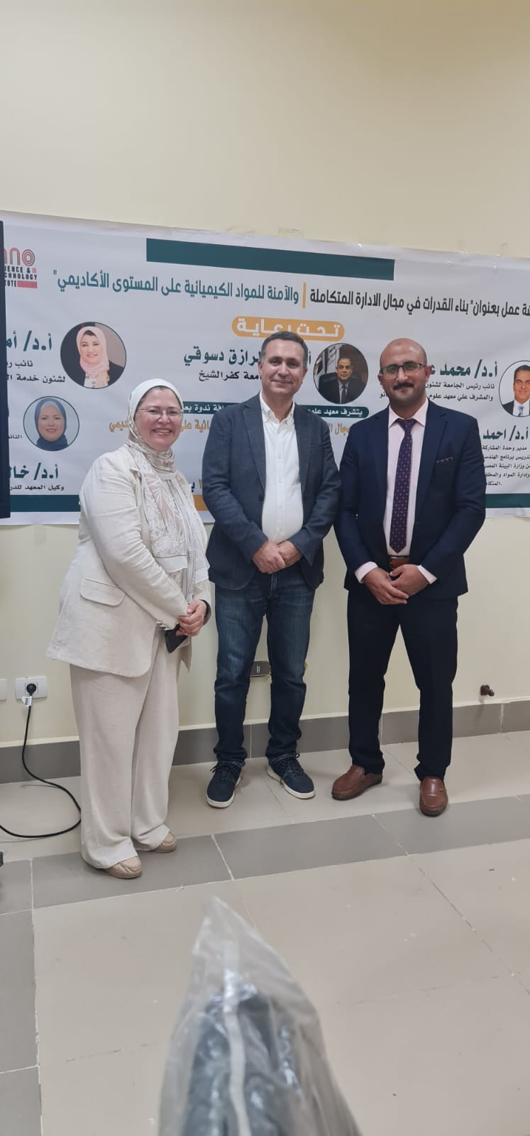 نظم معهد علوم وتكنولوجيا النانو بجامعة كفر الشيخ، ورشة عمل توعوية تحت عنوان " بناء القدرات في مجال الإدارة المتكاملة والأمنة للمواد الكيميائية على المستوى الأكاديمي "، والتى استمرت لمدة ثلاثة أيام بدا من الاثنين الموافق 1/7/2024 الى الموافق الاربعاء 3/7/2024، للتوعية بأهمية الإدارة السليمة للمخلفات الكيميائية والخطرة تحت رعاية الاستاذ الدكتور عبد الرازق دسوقي رئيس الجامعة، والاستاذ الدكتور محمد عبد العال نائب رئيس الجامعة لشئون التعليم والطلاب والمشرف على معهد علوم وتكنولوجيا النانو، والدكتورة أمانى شاكر نائب رئيس الجامعة لشئون خدمة المجتمع وتنمية البيئة، وذلك ضمن فاعليات قطاع خدمة المجتمع وتنمية البيئة بمعهد علوم وتكنولوجيا النانو باشراف الدكتورة علا البردى وكيل المعهد لشئون خدمة المجتمع وتنمية البيئة، والدكتور خالد الكيلانى وكيل المعهد للدراسات العليا والبحوث، وقد حاضر الندوة الدكتور أحمد فهمي مدير وحدة المشاركة الصناعية بمدينة زويل وعضو هيئة تدريس برنامج الهندسة البيئية بمدينة زويل واستشاري معتمد من وزارة البيئة المصرية في مجال الدراسات والقياسات البيئية وإدارة المواد والمخلفات الخطرة وخبير دولي في مجال الادارة المتكاملة للمواد الكيميائية الخطرة.