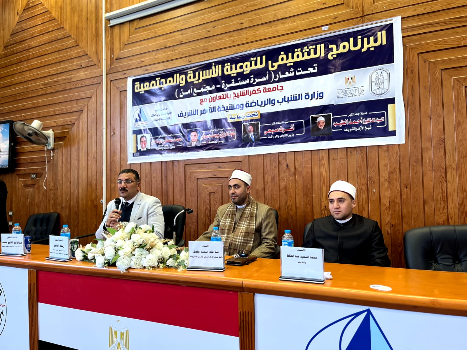 نظمت جامعة كفر الشيخ ندوة دينية بكلية الطب البيطري ، اليوم الاثنين، 18 / 4/ 2016 م ، تحت عنوان "دور الشباب في خدمة الوطن وأخلاق الإسلام " وذلك استكمالا لسلسلة القوافل الدعوية والإرشاد الديني الذى تنظمها وزارة الأوقاف بالتعاون مع قطاع شئون خدمة المجتمع وتنمية البيئة بالجامعة، تحت رعاية الدكتور محمد مختار جمعة وزير الأوقاف والدكتور ماجد عبد التواب القمري رئيس الجامعة .