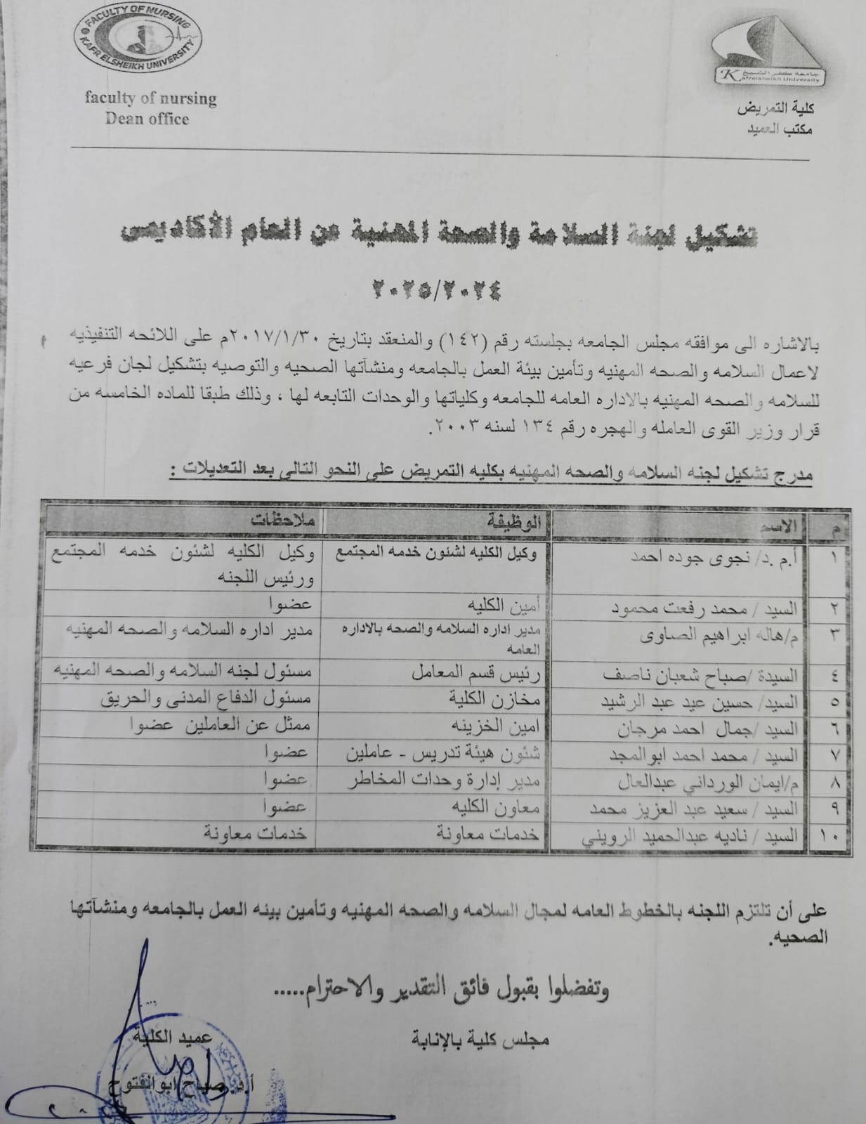 تشكيل لجنة الصحة والسلامة المهنية عن العام الجامعي 2025/2024م