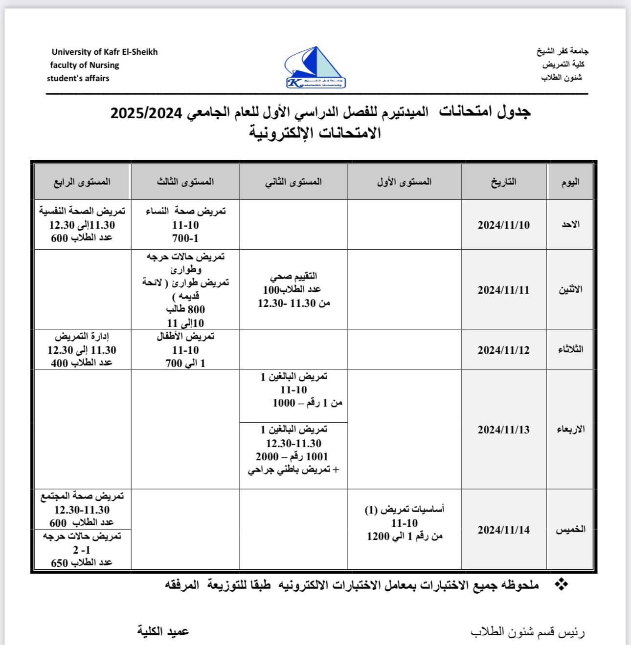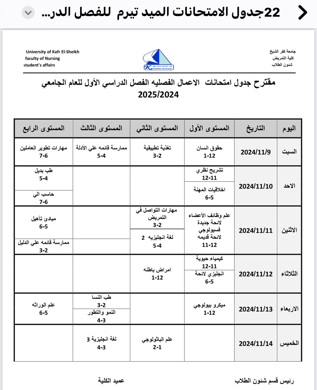 جدول الامتحانات الاعمال الفصليه للفصل الدراسي الاول