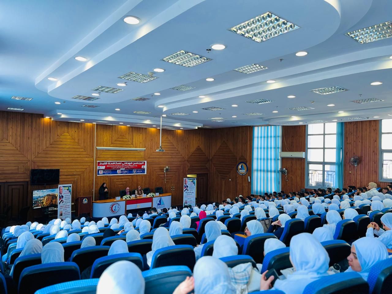 بهدف رفع الوعى الصحى للشباب الجامعي عن مرض الايدز وطرق انتقاله والوقايه منه وتصحيح المفاهيم المغلوطة المتداوله عنه ، يأتي ذلك في اطار حرص الدوله على تحقيق اهداف التنمية المستدامه