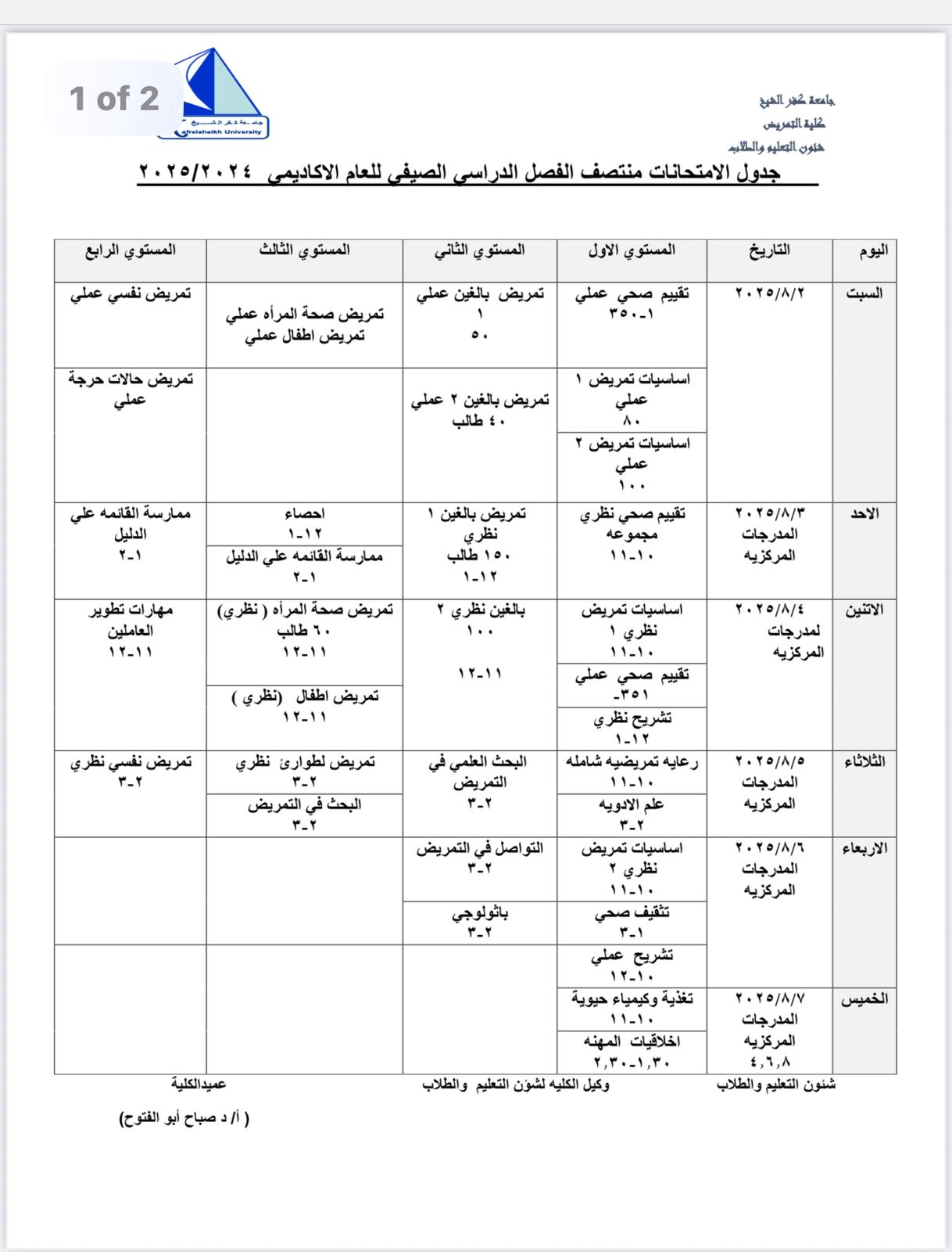 جدول امتحانات منتصف الفصل الدراسي للفصل الصيفي 2024/2025م