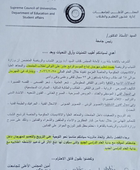 على من يرغب الاشتراك فى مهرجان ابداع الموسم الرابع عشر العام الجامعي 2025- 2026 التوجه لقسم رعاية الشباب بكلية التمريض