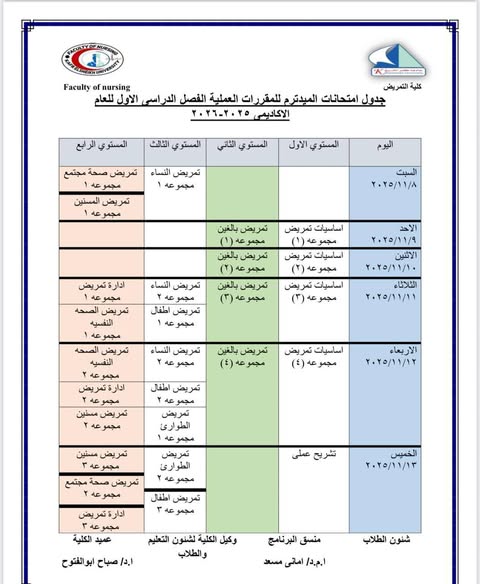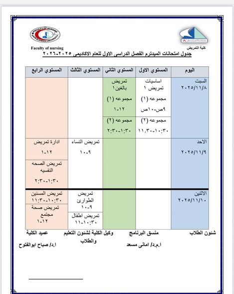 جدول امتحانات الميدتيرم للفصل الدراسي الاول للعام الجامعي 2025/2026م