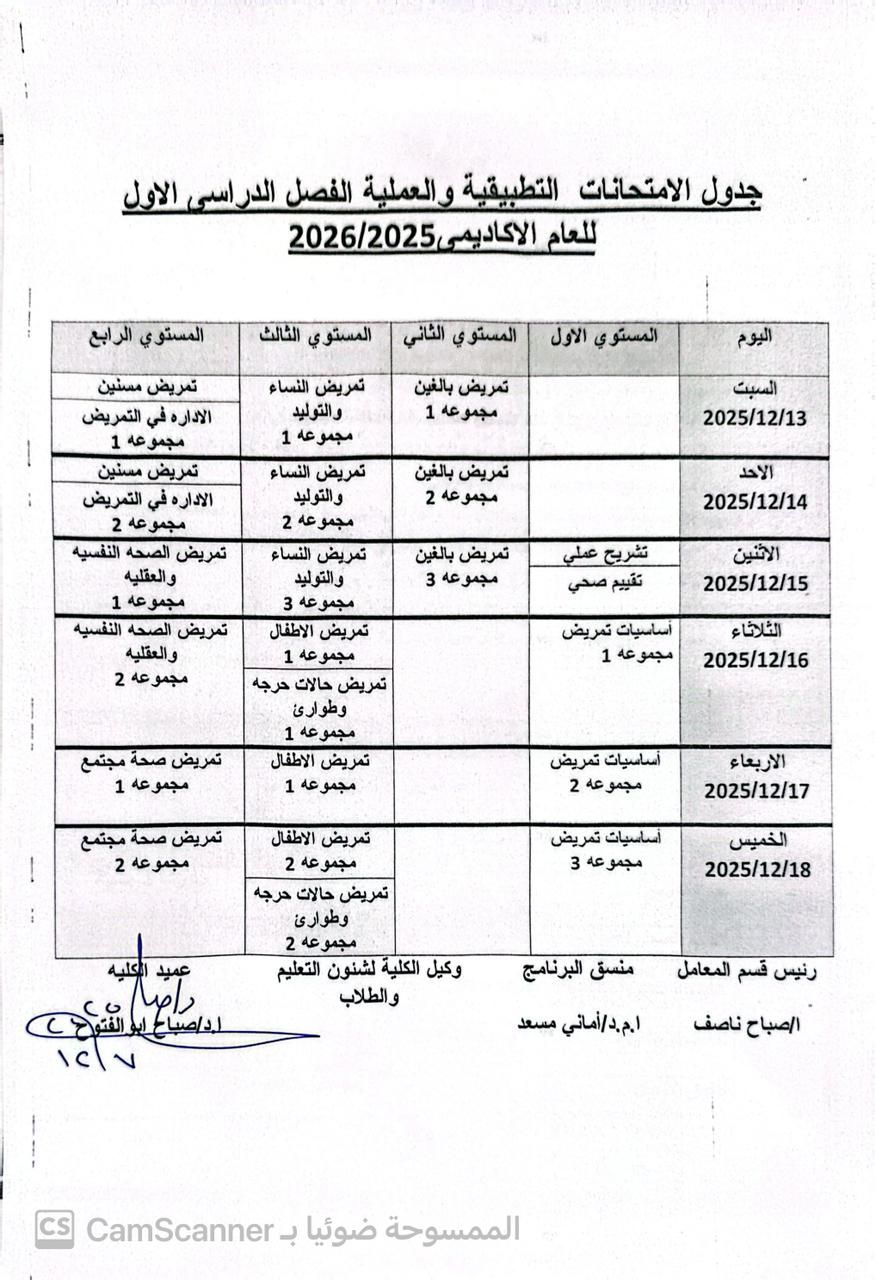 جدول الامتحانات العمليه للفصل الدراسي الاول للعام الاكاديمي 2025 /2026
