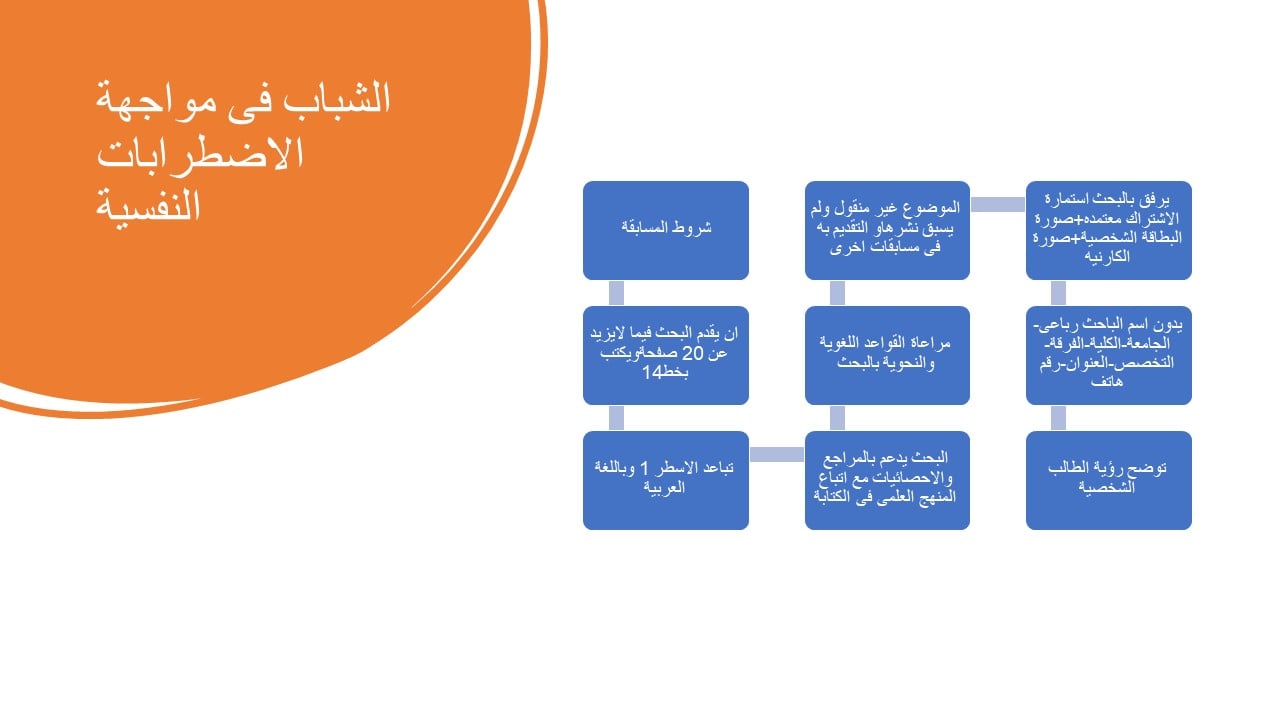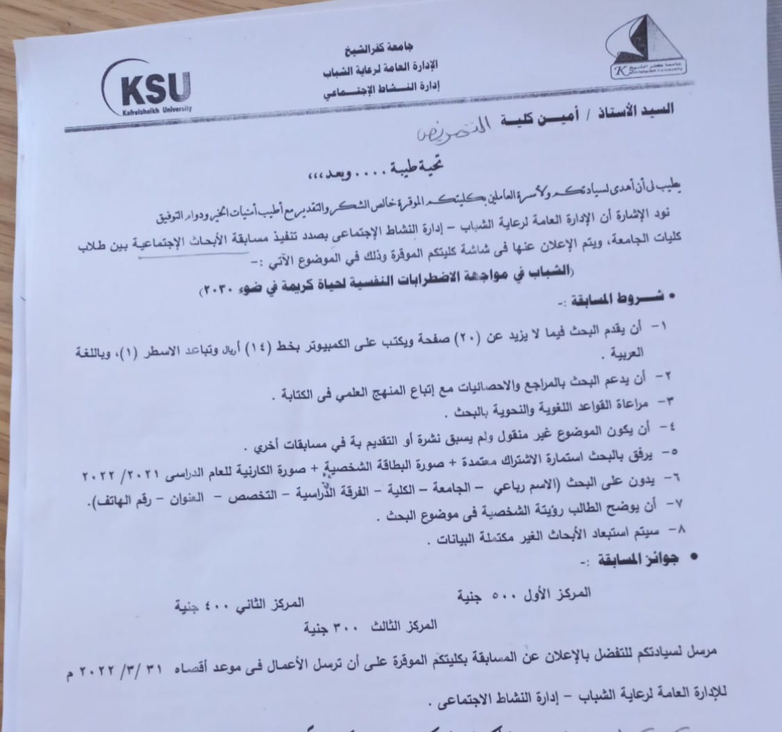 تحت عنوان الشباب فى مواجهة الاضطرابات النفسية لحياة كريمه تقام مسابقة الأبحاث الاجتماعية فعلى الراغبين التقدم للابحاث بالشروط الموضحة بالصورة وتقديمها لرعاية الشباب بالكلية قبل يوم 31