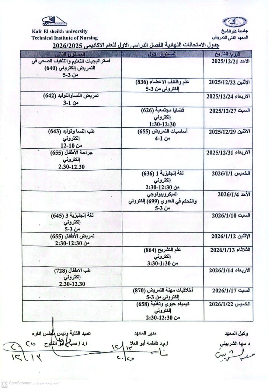 جدول الامتحانات النظرية الفصل الدراسي الأول للعام الجامعى ٢٠٢٥/٢٠٢٦