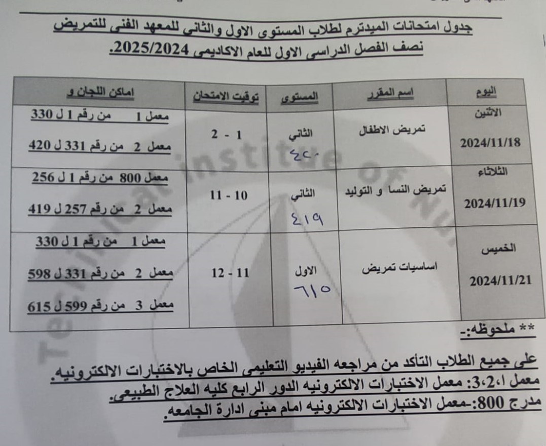 جدول امتحانات نصف الفصل الدراسى الاول (الميدترم) 2024 / 2025