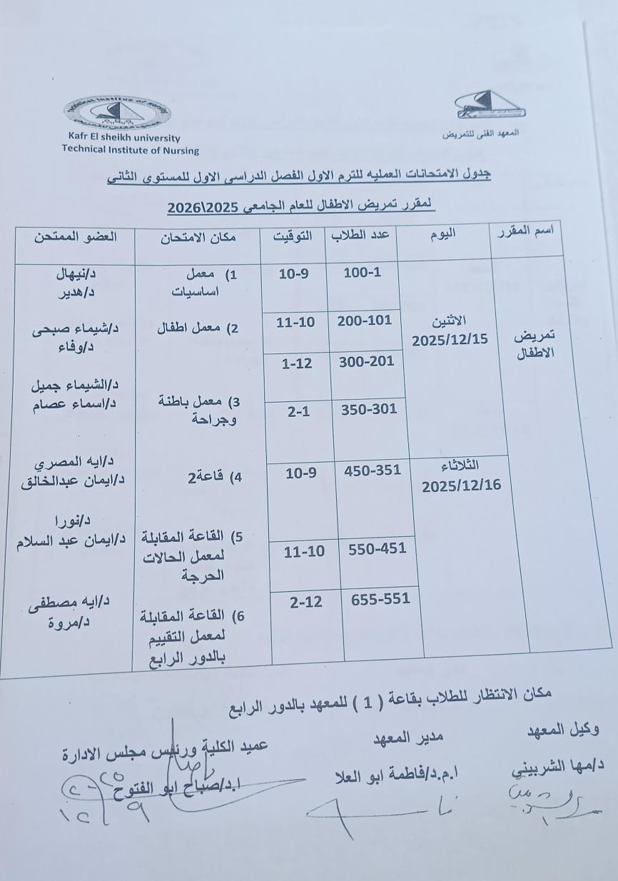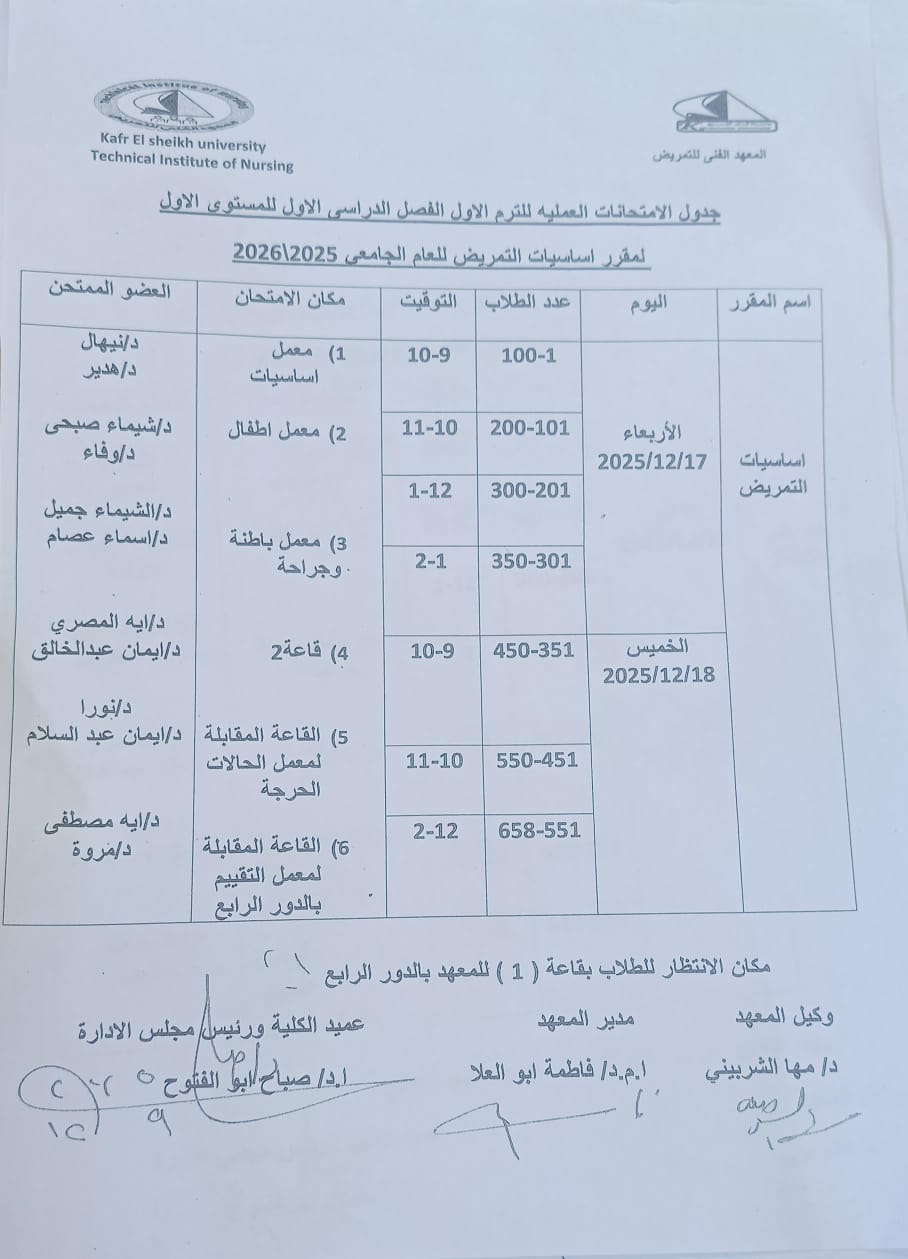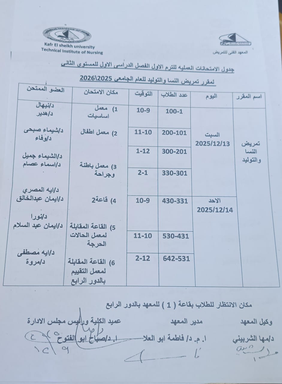 جدول الامتحانات العمليه للمستوى الاول والثانى الرجاء من جميع الطلاب الالتزام بمواعيد الحضور طبقا للتوزيعة