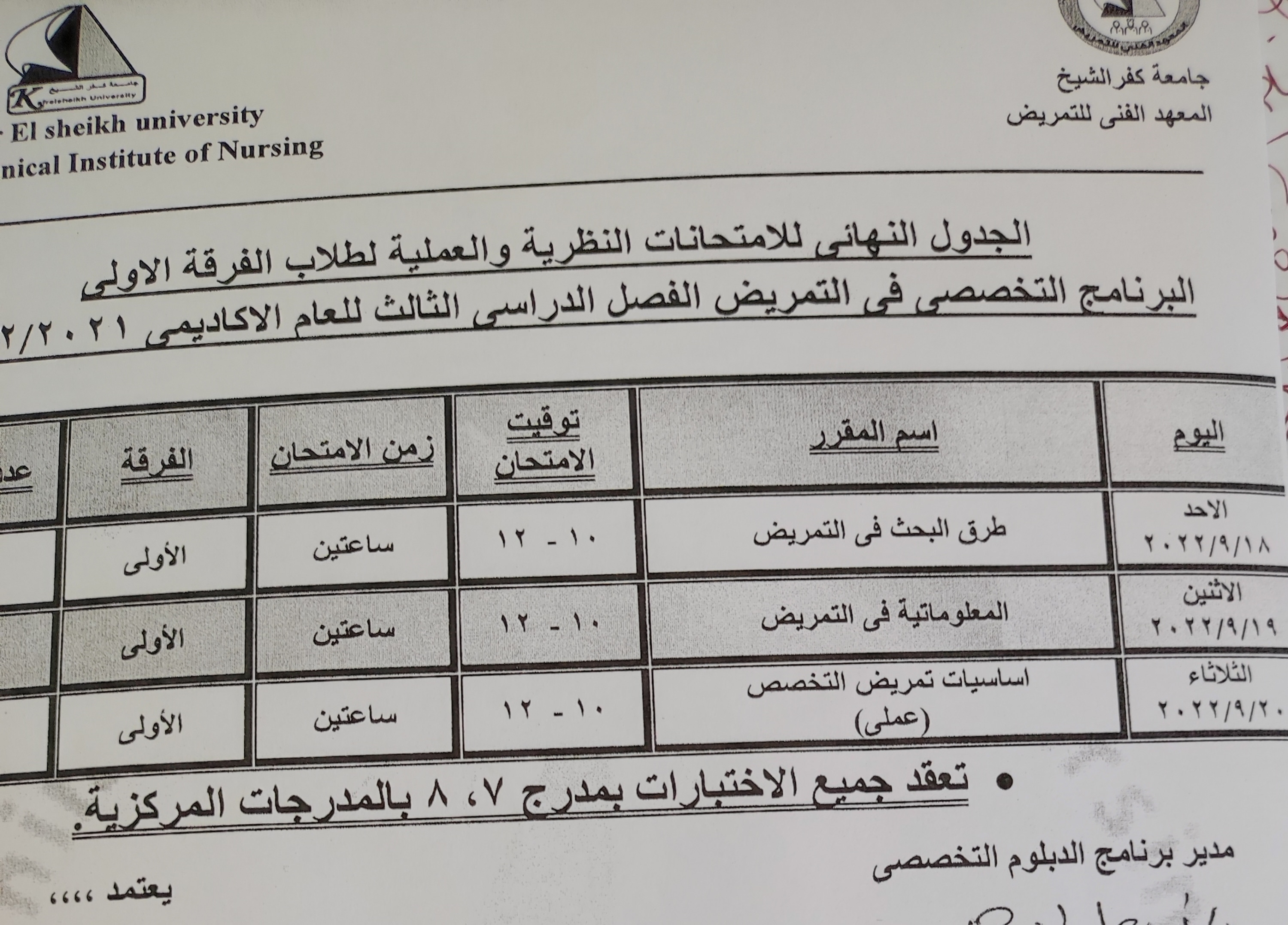 جدول امتحانات الفصل الدراسى الثالث لطلاب الفرقة الاولى البرنامج التخصصى فى التمريض للعام الجامعى 2021 -2022